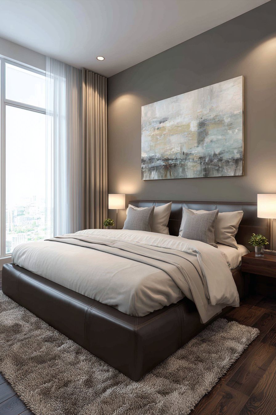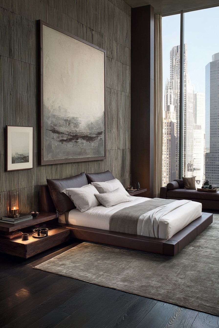 Dark hardwood floors and textured area rug add warmth to the contemporary aesthetic, preventing the masculine elements from feeling cold or uninviting. This urban contemporary approach to California king bedroom design suits those who appreciate refined masculine style—spaces with strong presence and sophisticated simplicity that feel intentional and confident.
