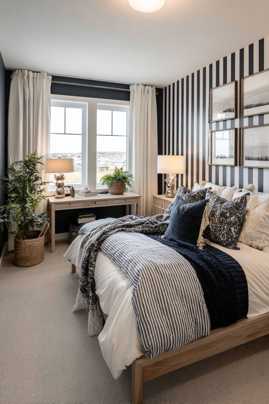 Narrow console tables serve as space-efficient nightstands, their slim profiles providing necessary function without consuming precious width. Vertical striped wallpaper on the accent wall creates illusion of height, drawing the eye upward and counteracting the room’s narrow dimensions. Strategically placed mirrors reflect light and visually expand the space, their reflective surfaces creating perceived depth while amplifying available natural and artificial light.