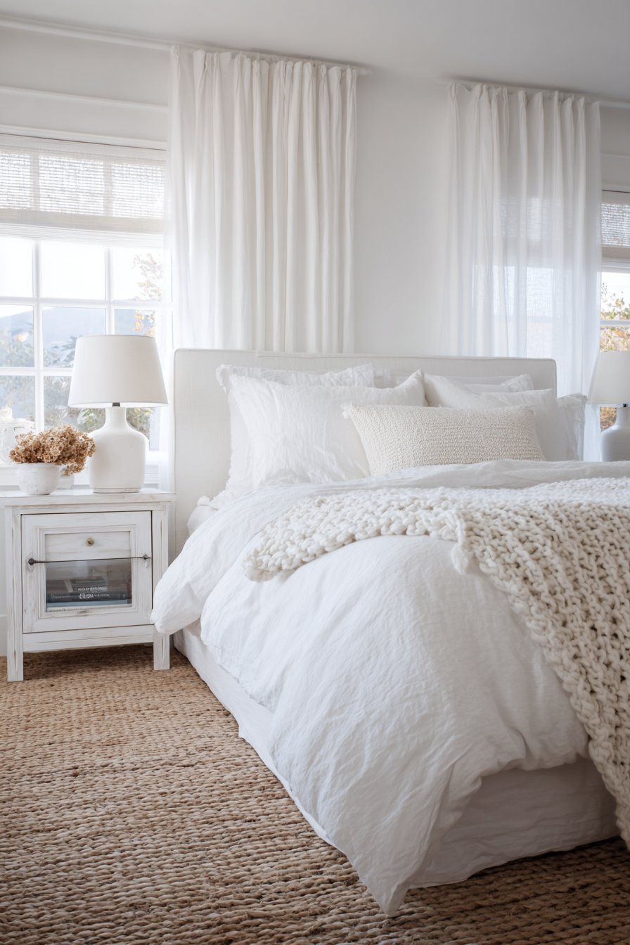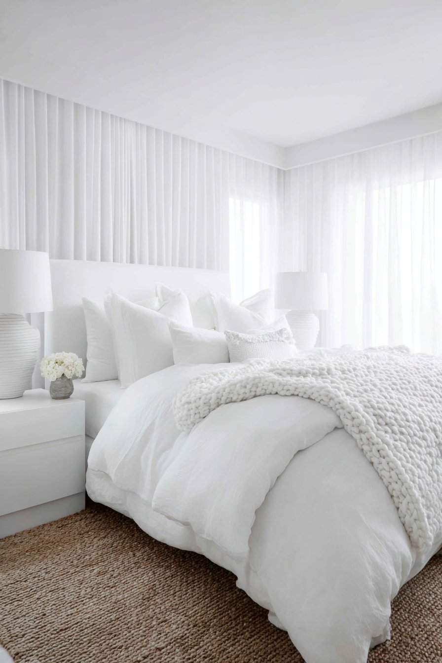 White-washed wood nightstands and white ceramic lamps maintain the monochromatic scheme while introducing subtle material variety, the different whites and off-whites creating gentle tonal gradation. A natural jute rug adds subtle warmth and organic texture, its neutral tan tone providing the only deviation from pure white while remaining within the calm, natural palette. Floor-to-ceiling white curtains frame windows, their flowing fabric adding softness and movement while filtering incoming light into diffused glow.