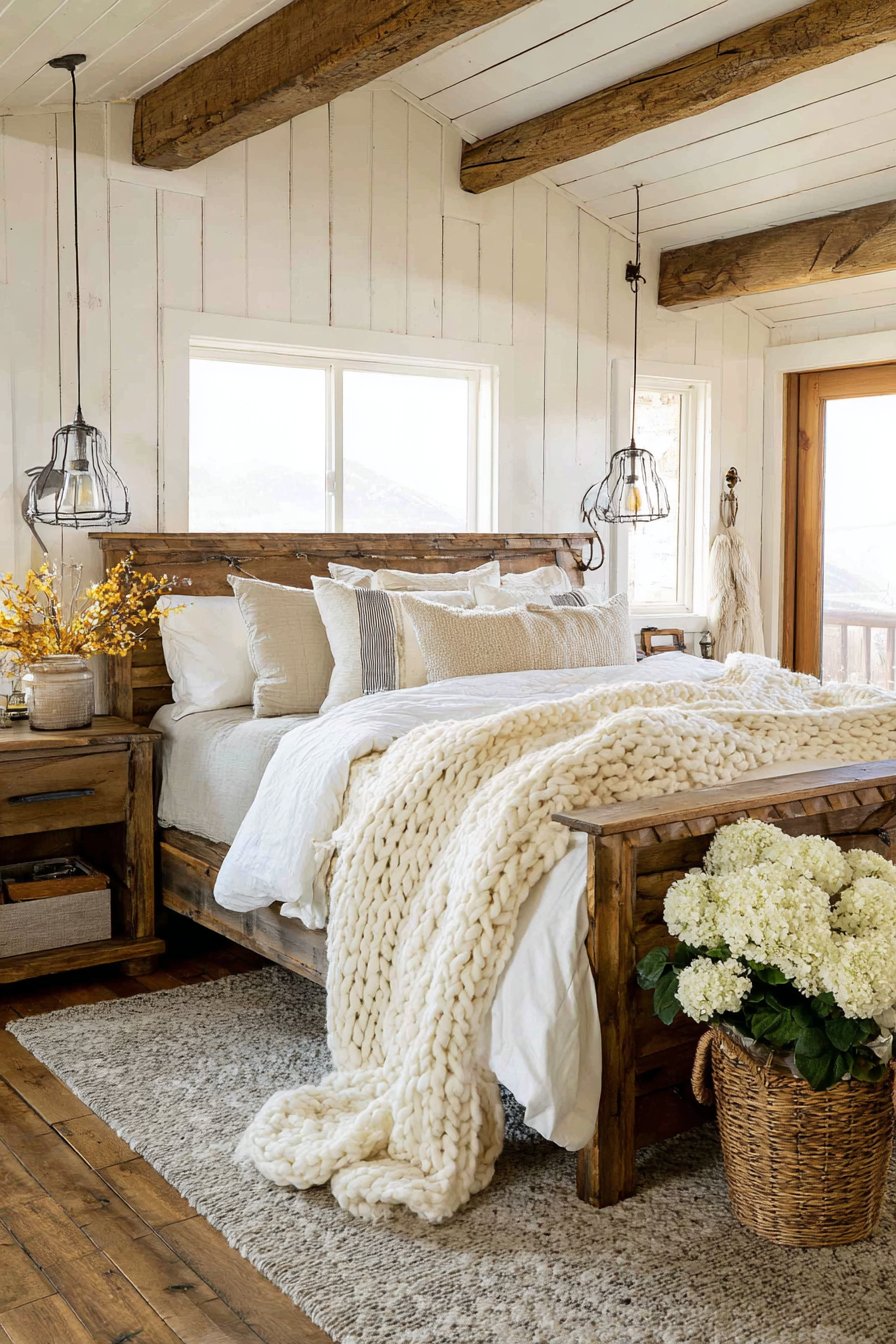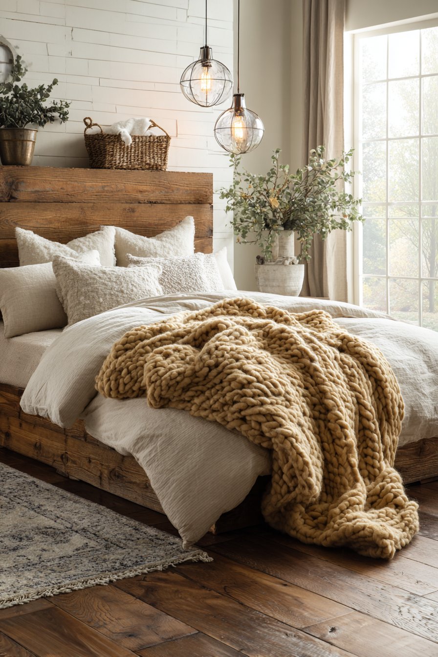 Vintage-inspired metal and glass pendant lights flank the bed, their industrial-meets-farmhouse aesthetic bridging rustic and refined. The lighting fixtures cast a warm, inviting glow that enhances the room’s cozy atmosphere while their transparent glass allows the eye to travel through the space unobstructed. A chunky knit throw blanket in cream tones drapes casually across the bed, its tactile appeal inviting touch and adding dimensional texture to the layered linen bedding beneath.