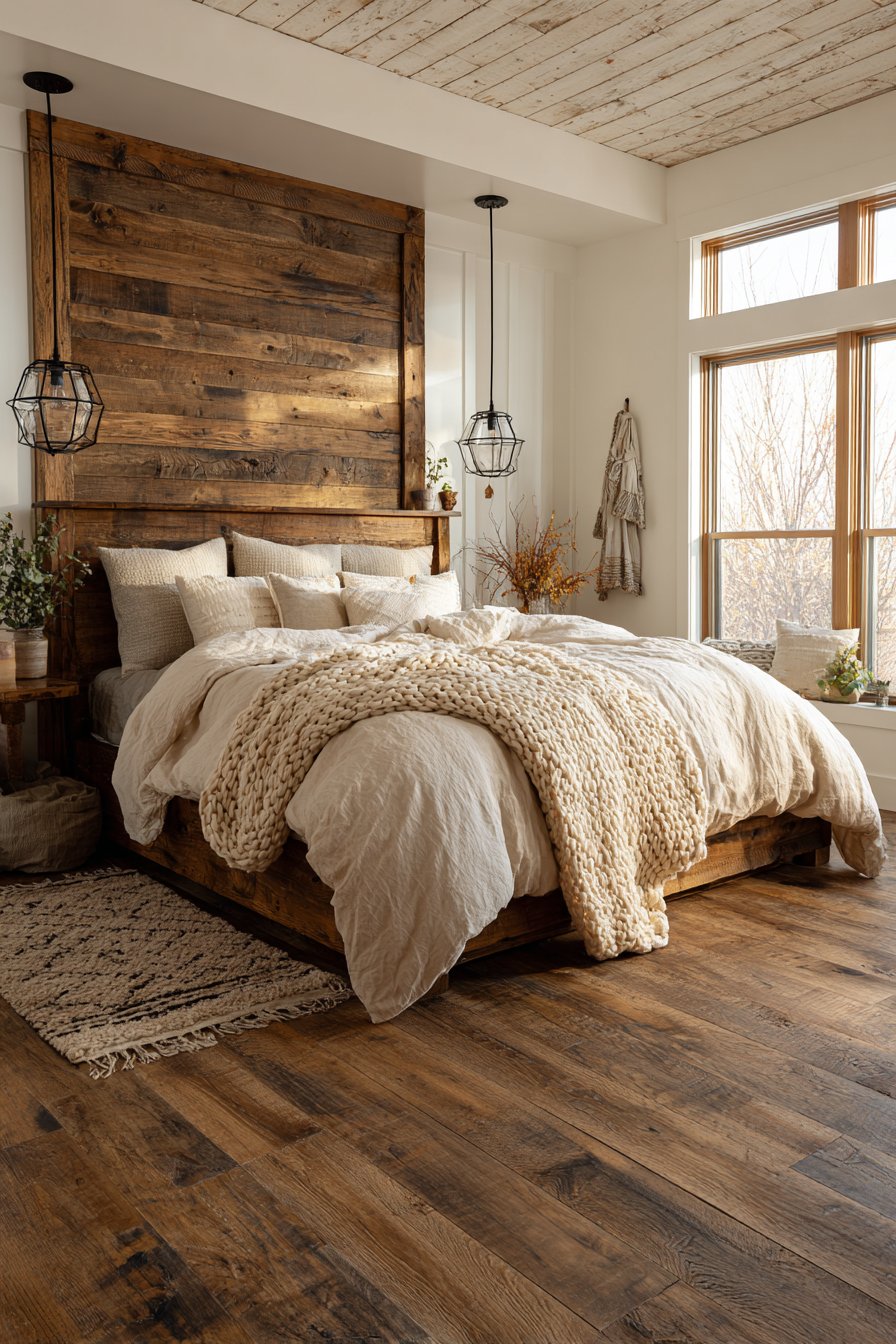 The farmhouse bedroom embraces authenticity and comfortable simplicity, creating a space that feels like a warm hug at the end of each day. A reclaimed wood California king bed frame with a rustic plank headboard serves as the room’s heart, its weathered texture and honest construction celebrating natural imperfections as design features. The white shiplap accent wall behind the bed provides classic farmhouse character while brightening the space and creating textural contrast against the warm honey-toned flooring.