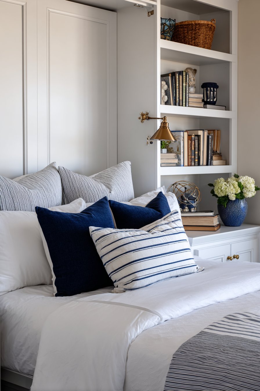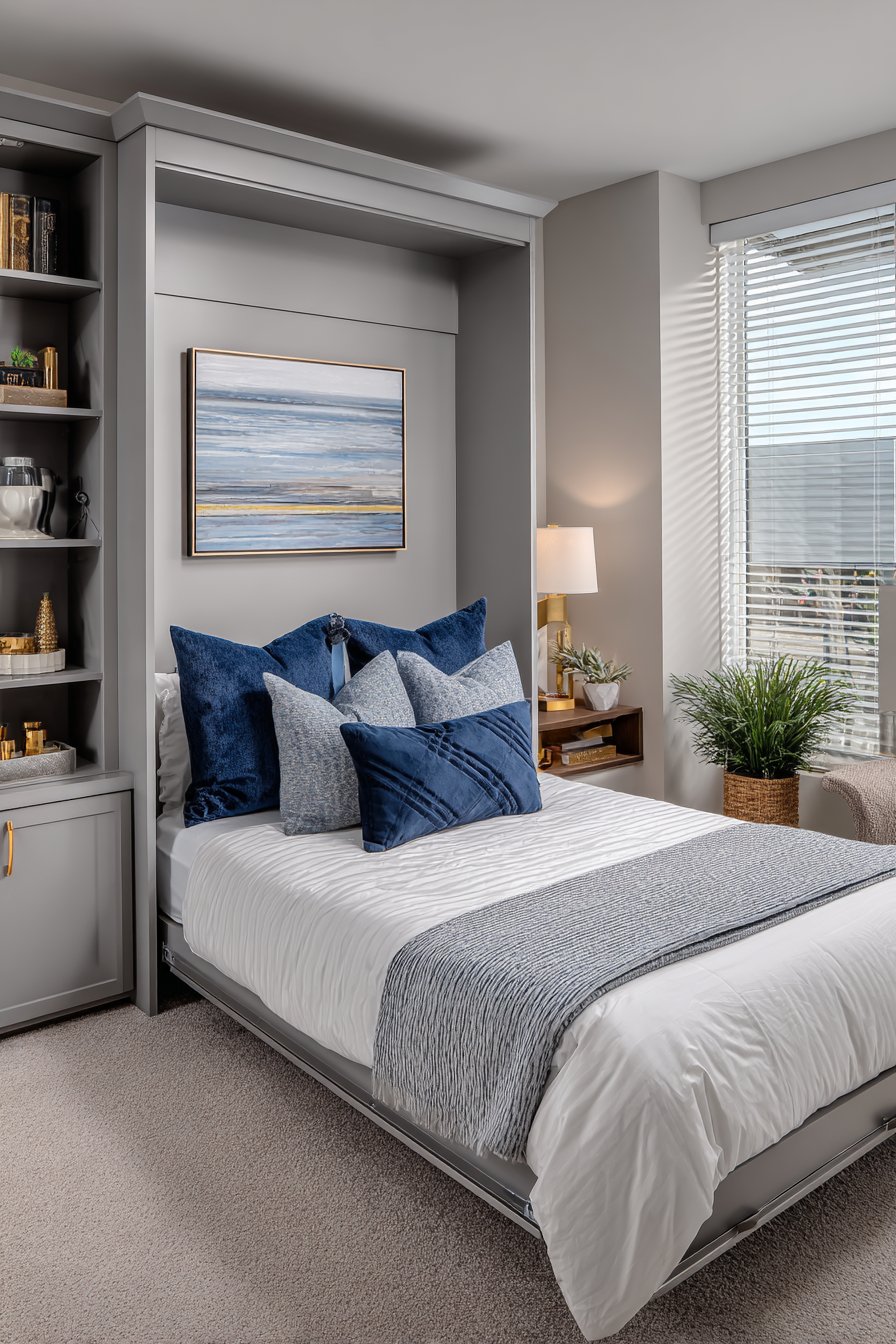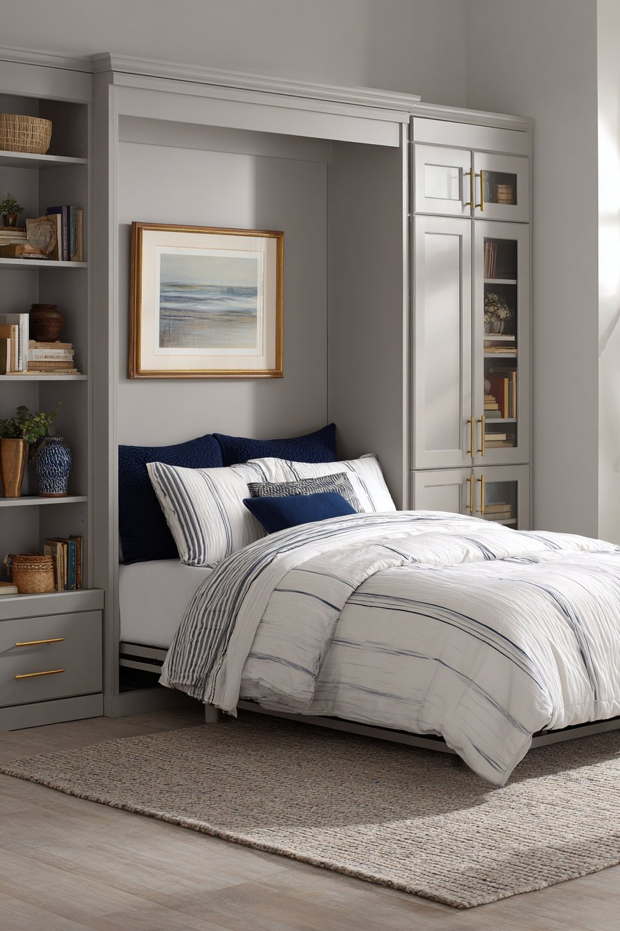Soft grey cabinetry with brushed brass hardware creates a refined aesthetic that conceals the bed’s mechanical function, ensuring the room feels intentionally designed whether the bed is visible or tucked away. When deployed for sleeping, the California king mattress is dressed in crisp white bedding with navy accent pillows, creating a fresh, hotel-inspired look that contradicts any notion of Murphy beds as purely utilitarian. The navy accents add depth and sophistication while maintaining the space’s calm, uncluttered atmosphere.