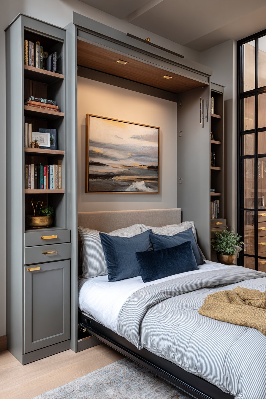 Ingenious design solutions become essential when space is at a premium, and this California king Murphy bed system demonstrates that even the largest mattress size can integrate into a multifunctional room. The wall-mounted bed system features surrounding built-in shelving that provides integrated nightstand functionality, eliminating the need for additional floor-standing furniture. When the bed is deployed, these shelves remain accessible, holding everything from bedside reading materials to decorative elements that maintain the room’s visual interest throughout the day.