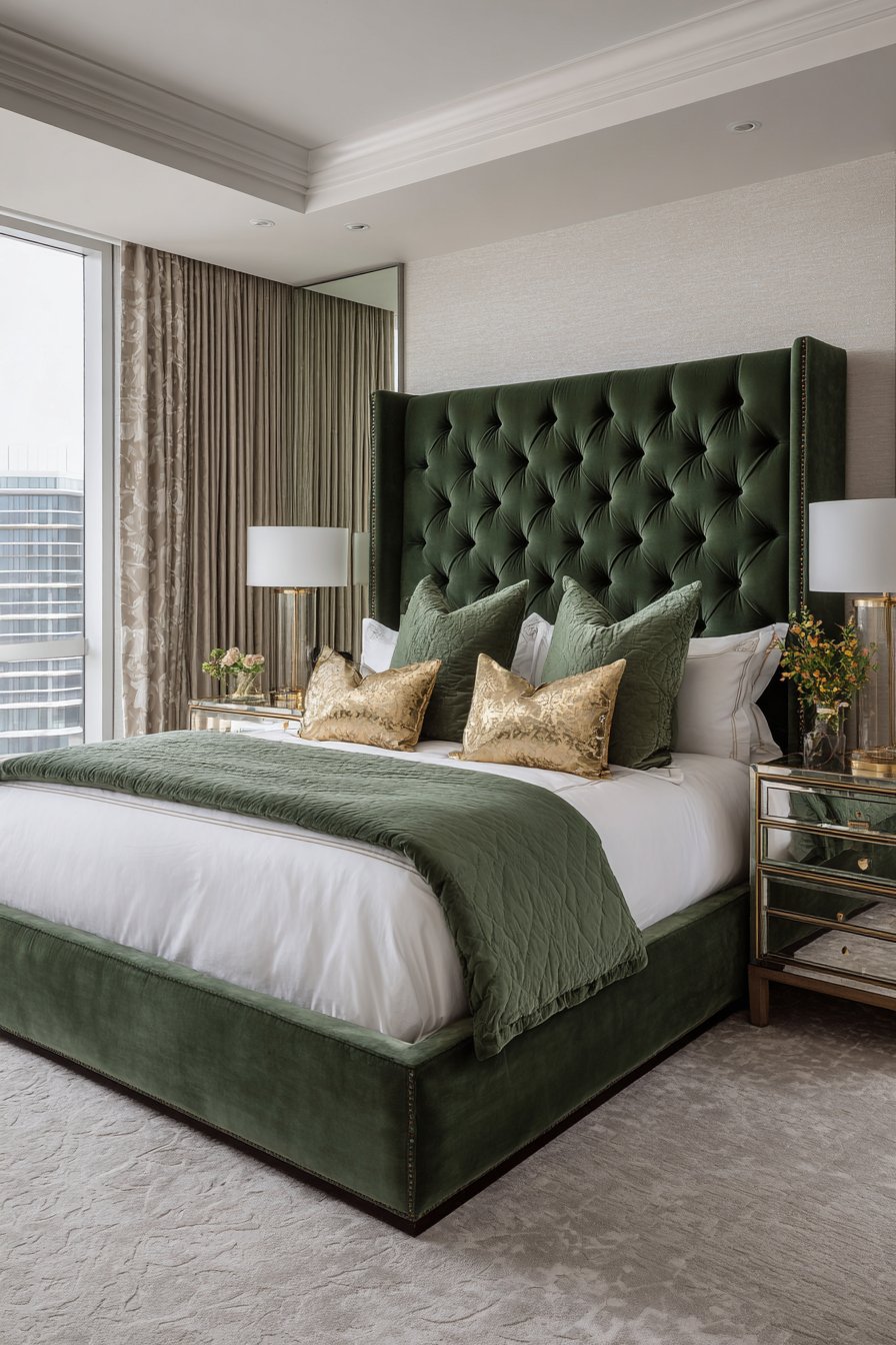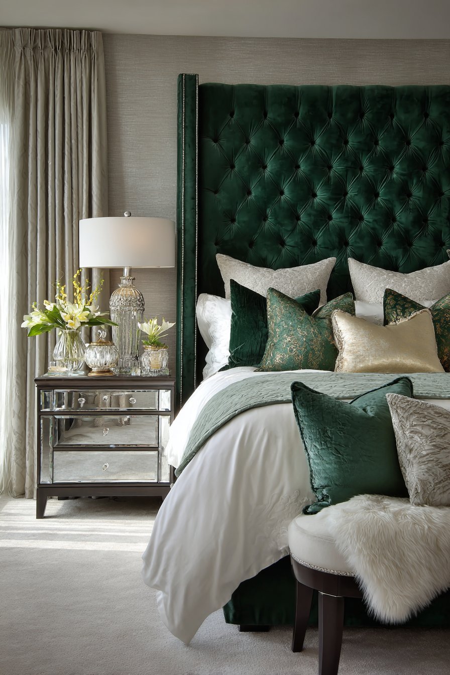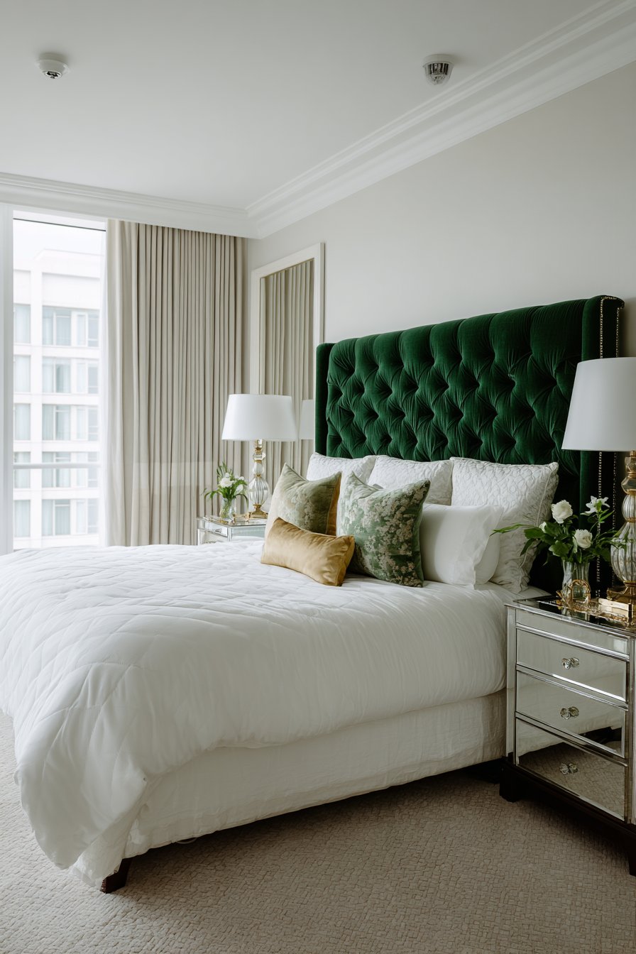 Crisp white bedding provides the perfect counterpoint to the saturated headboard, its pristine simplicity allowing the emerald velvet to star while maintaining the fresh, clean feeling essential to hotel-quality comfort. Decorative pillows in coordinated gold and green tones bridge these primary elements, their metallic threads catching lamplight and adding dimensional luxury. Mirrored nightstands amplify both natural and artificial light, their reflective surfaces making the room feel more spacious while adding glamorous shine that elevates the entire aesthetic.