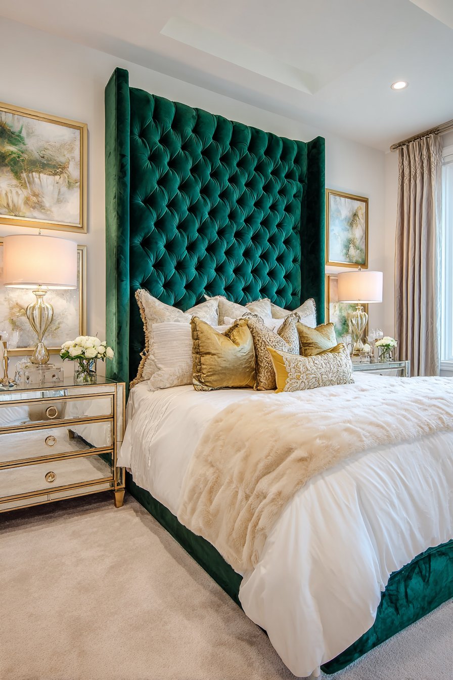 Some bedrooms transcend mere functionality to become experiences of pure indulgence, and this hotel-inspired California king suite embodies that aspirational quality. An oversized tufted headboard reaching nearly to the ceiling commands immediate attention, upholstered in rich emerald green velvet that catches and reflects light with every subtle movement. The dramatic scale creates an architectural element that defines the entire space, while the jewel-tone color introduces sophistication and personality without requiring additional pattern or embellishment.