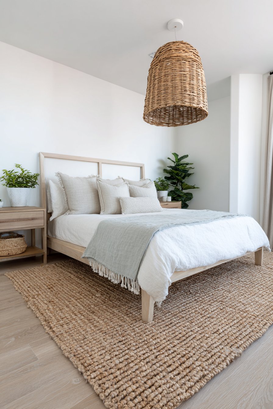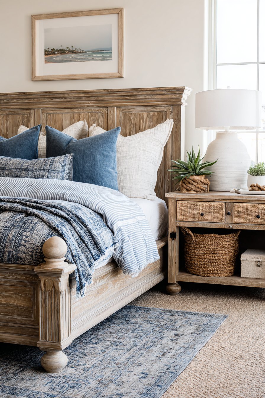 Woven rattan nightstands contribute additional organic texture while maintaining the light, airy feel essential to coastal design. White ceramic lamps with rope detailing provide the perfect finishing touch—subtle nautical references that enhance the theme without becoming cartoonish. This approach to California king bedroom design succeeds because it captures the essence of coastal living—relaxed, bright, natural—rather than relying on obvious beach motifs.