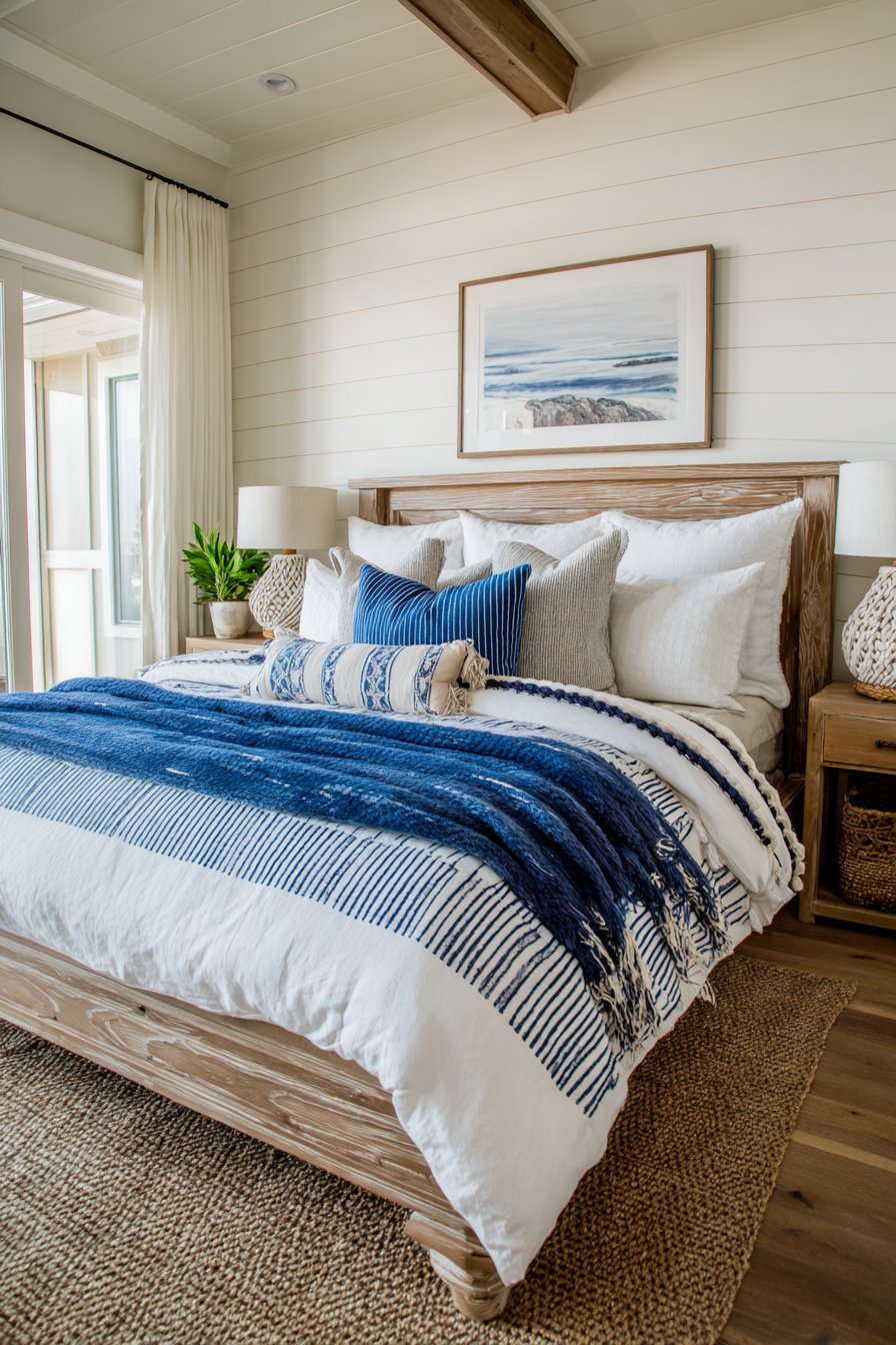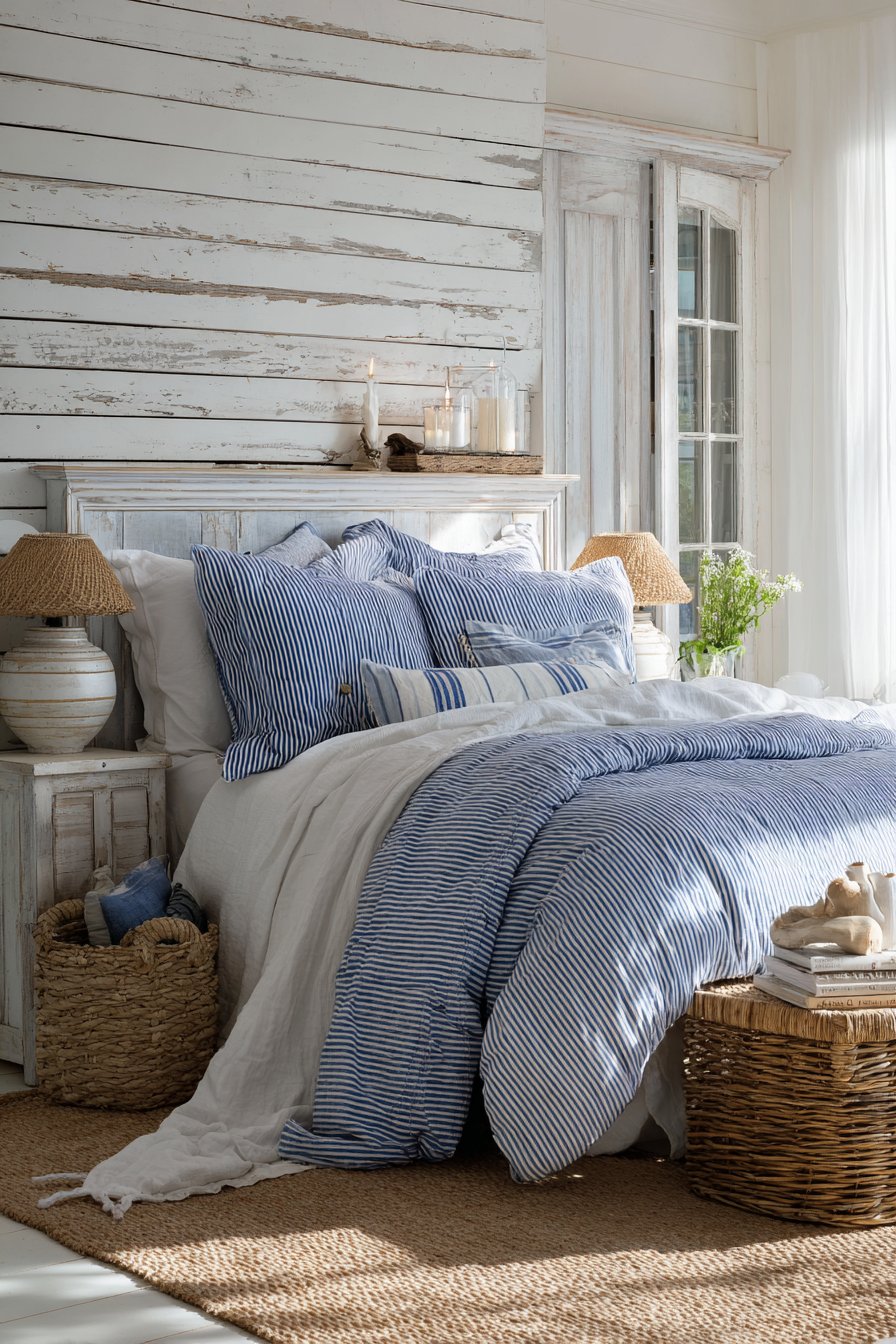 Layered bedding in blues and whites brings the ocean palette indoors, with crisp white sheets establishing the foundation and blue striped and solid pieces building sophisticated nautical style. The combination feels fresh and timeless rather than overly themed, walking the fine line between inspiration and literal interpretation. A natural jute rug anchors the bed while adding organic texture underfoot, its neutral tone grounding the color scheme and introducing natural fiber that connects to the seaside environment.