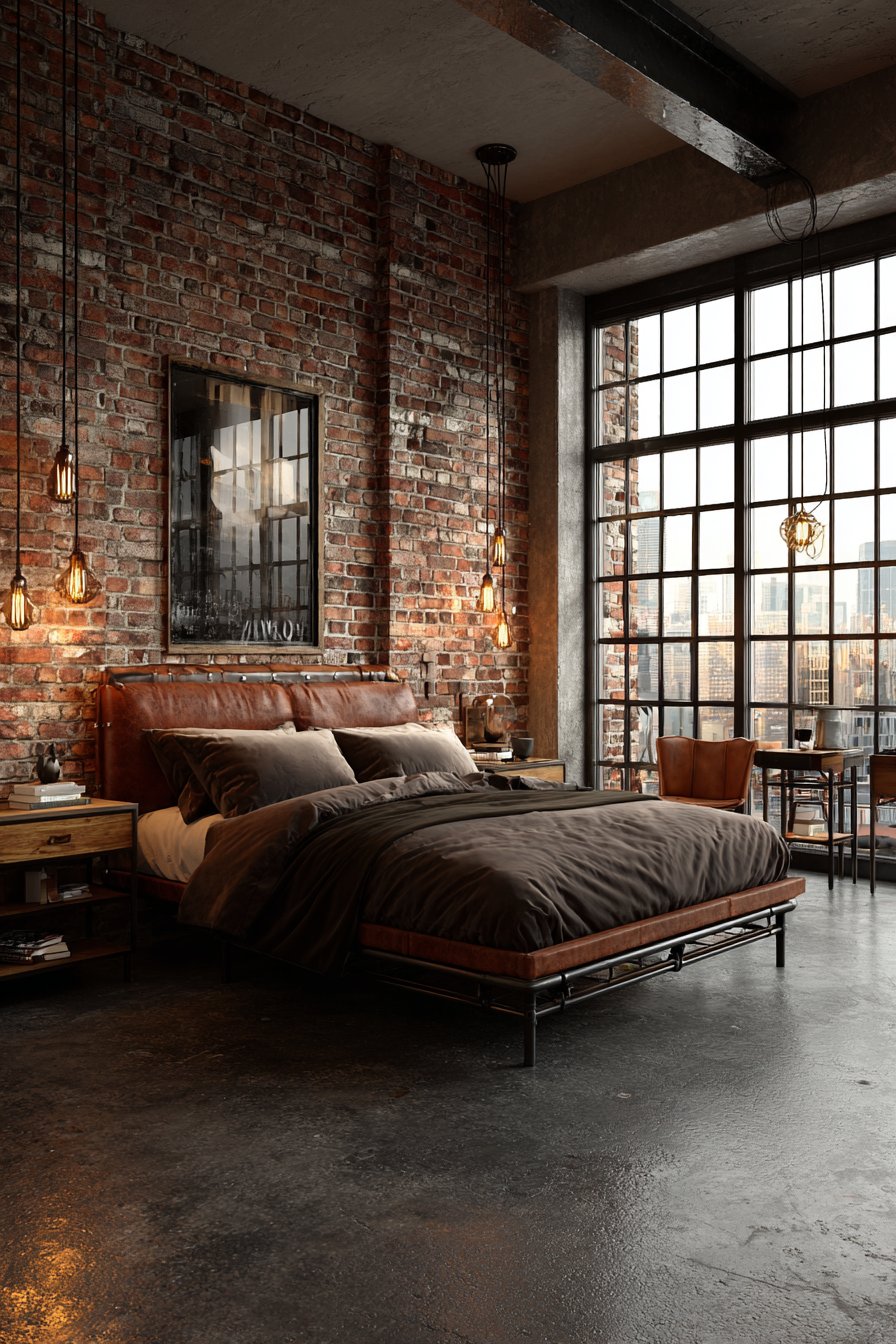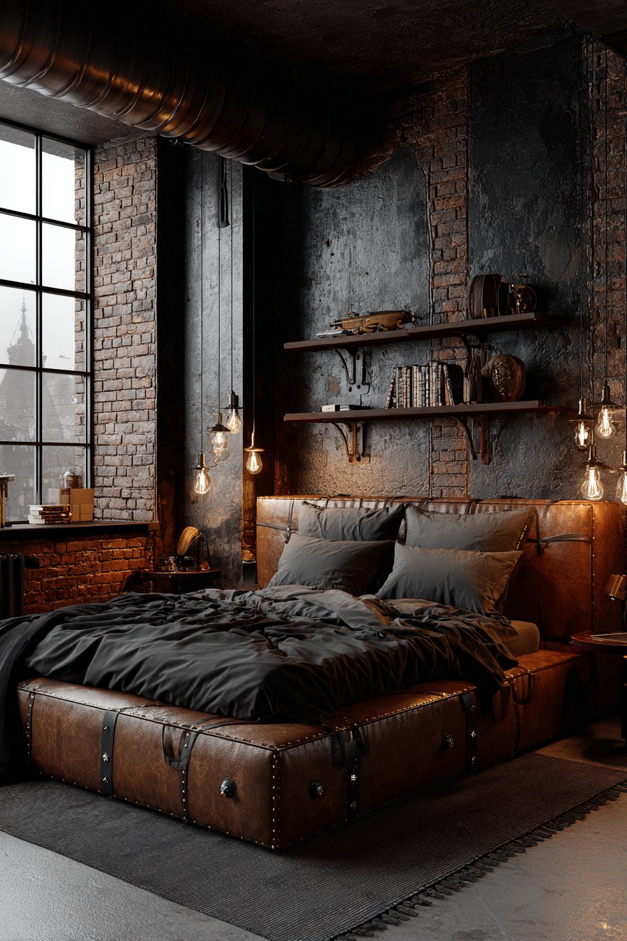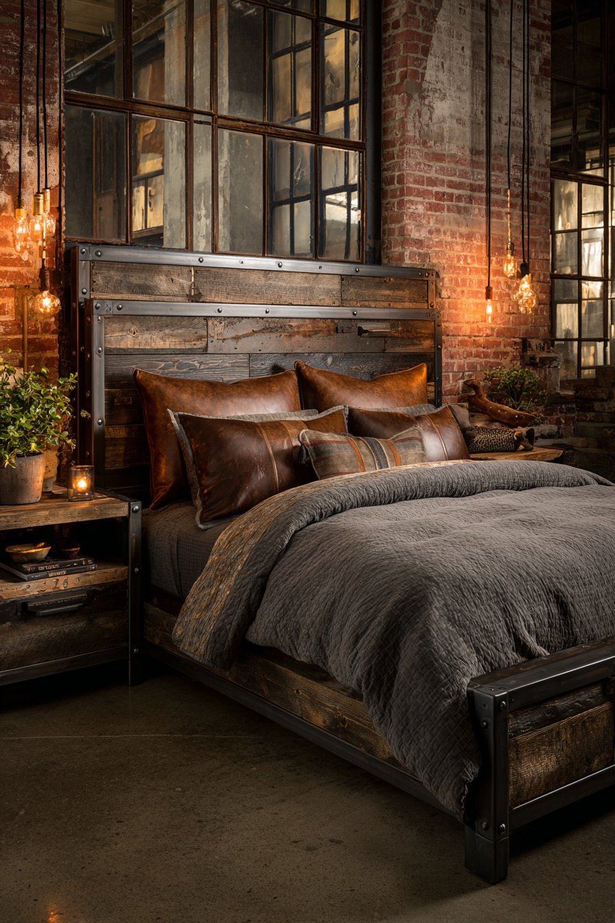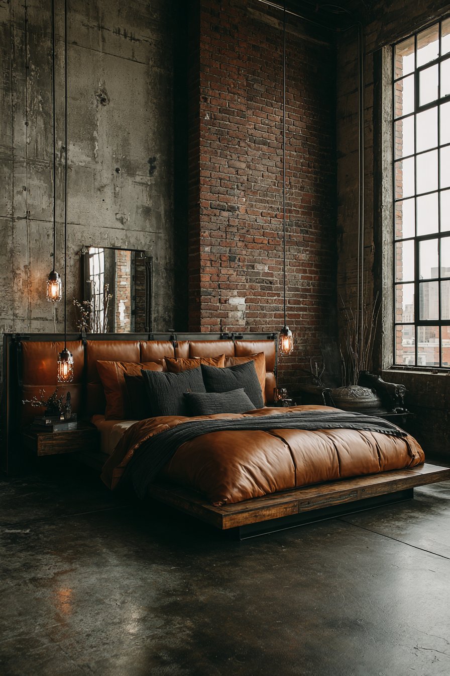 The industrial bedroom celebrates raw materials and honest construction, creating spaces with masculine sophistication and urban attitude. A California king bed on a substantial metal frame with exposed rivets and leather-upholstered headboard in cognac brown immediately establishes the room’s character—strong, authentic, and unapologetically bold. The leather develops beautiful patina over time, growing richer and more characterful with age, while the metal frame’s sturdy construction speaks to durability and quality.