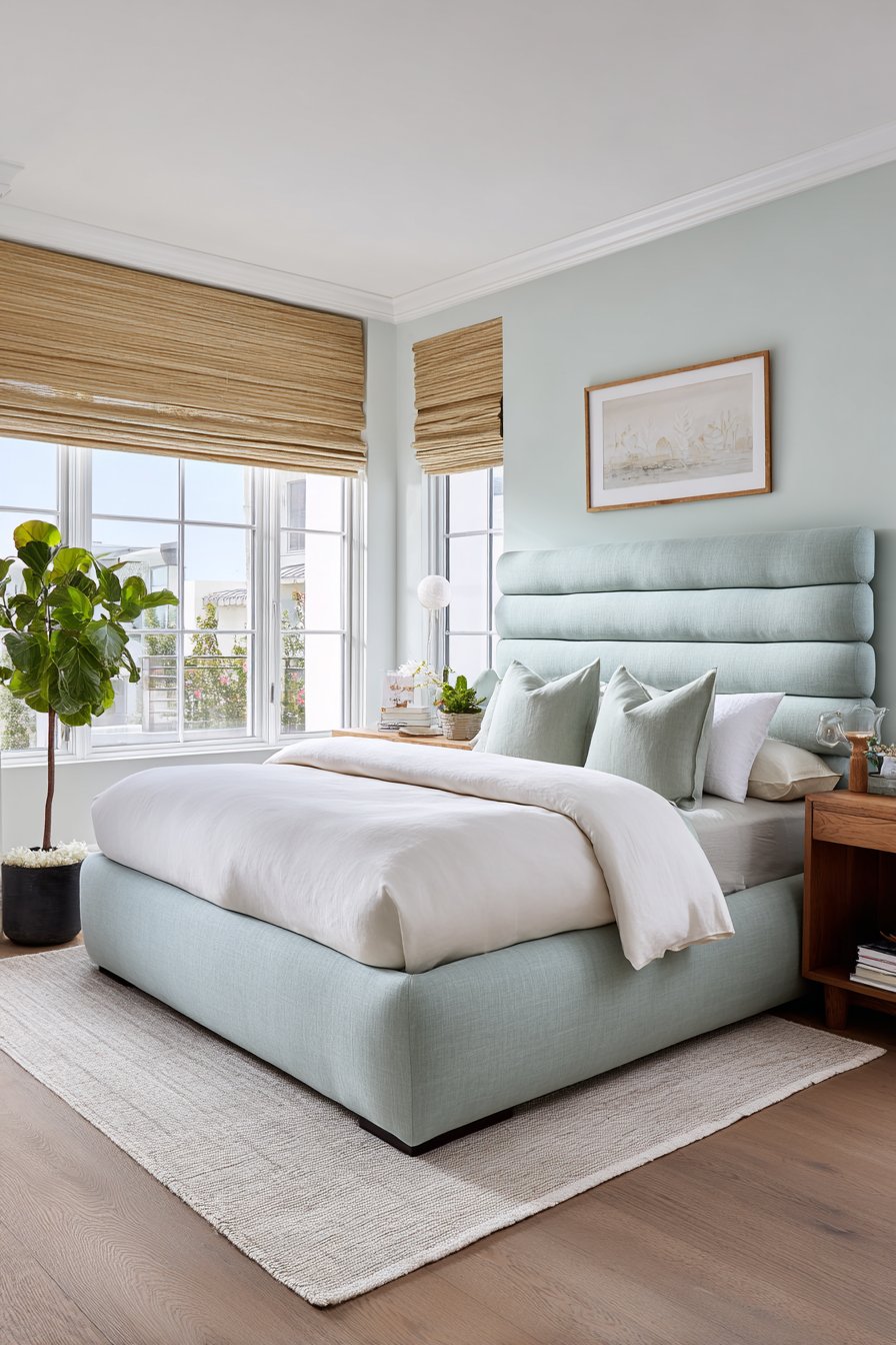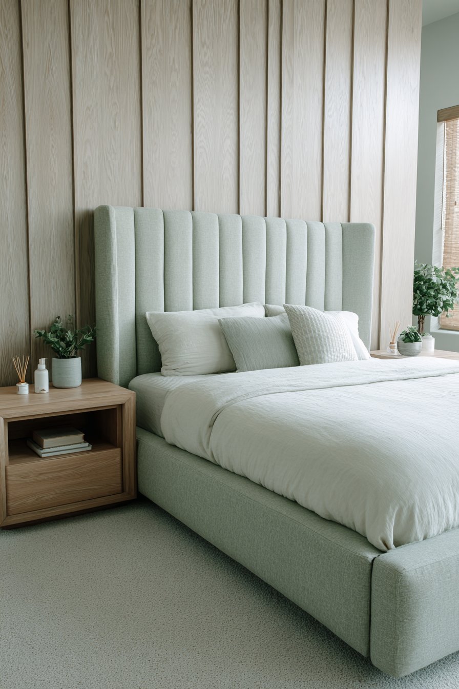 Creating a bedroom that functions as a personal spa requires attention to calming colors, natural materials, and sensory details that promote relaxation. An upholstered California king bed with tall padded headboard in soft sage green linen establishes the room’s tranquil foundation, the muted green promoting calm through its connection to nature. The substantial headboard provides comfortable support for reading or meditation while its gentle color becomes a soothing backdrop for rest.
