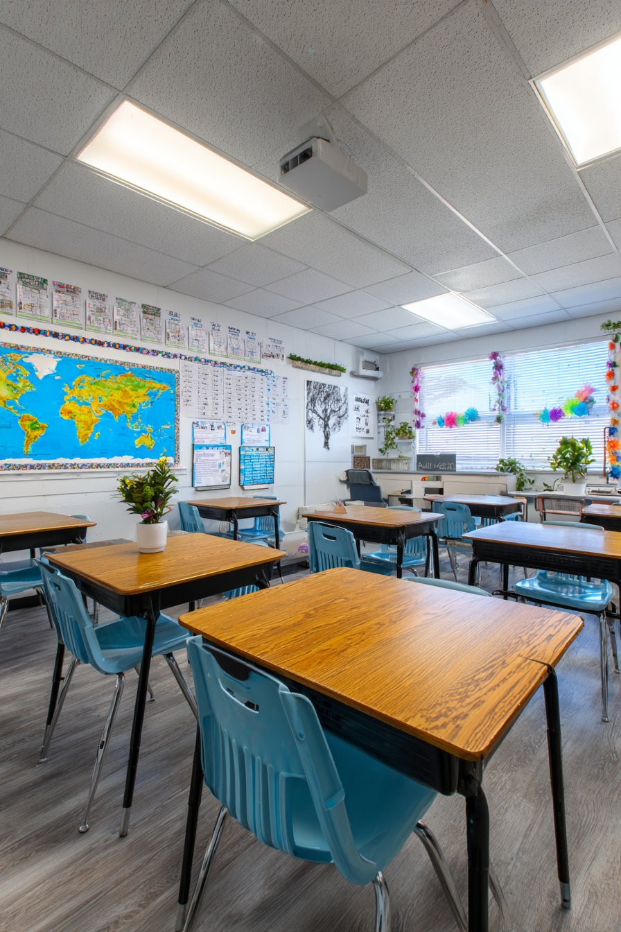 A “Caught Being Good” recognition board highlights positive behaviors observed in the classroom, creating public celebration of character in action rather than merely discussing values abstractly. Warm classroom lighting generates an affirming environment where character development receives the same attention and celebration as academic achievement. The values-based learning display communicates that who students are becoming as people matters as much as what they’re learning academically.
