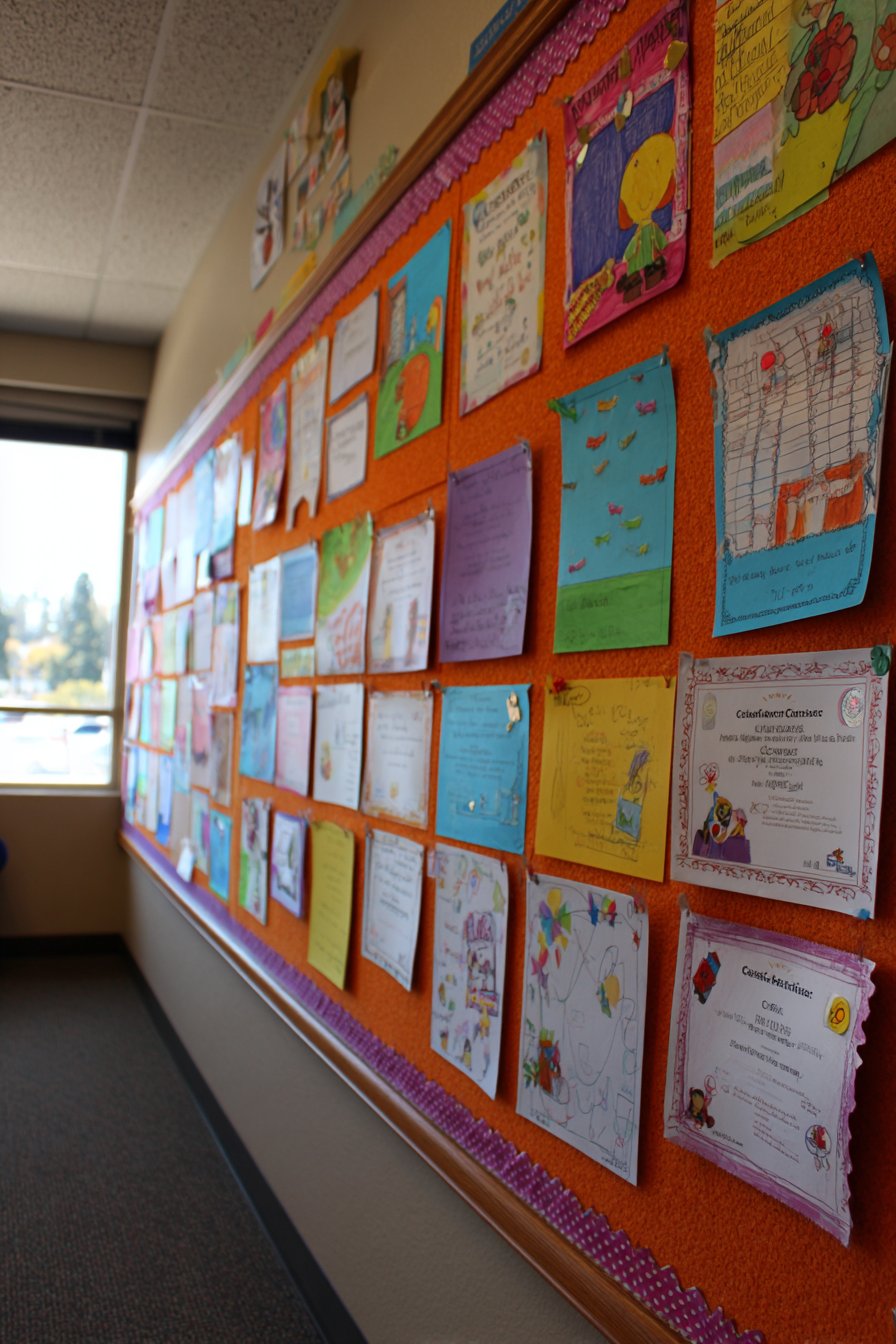 The strategic placement of this display ensures maximum visibility and interaction throughout the school day. Soft fluorescent classroom lighting creates even illumination across the entire surface, preventing shadows that might obscure student work and ensuring every piece receives equal attention. The organized presentation isn’t merely decorative—it serves multiple educational purposes including building student confidence, creating accountability for quality work, and providing visual examples of assignment expectations for current and future students.