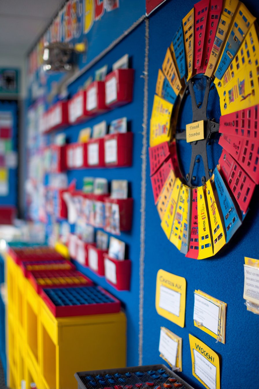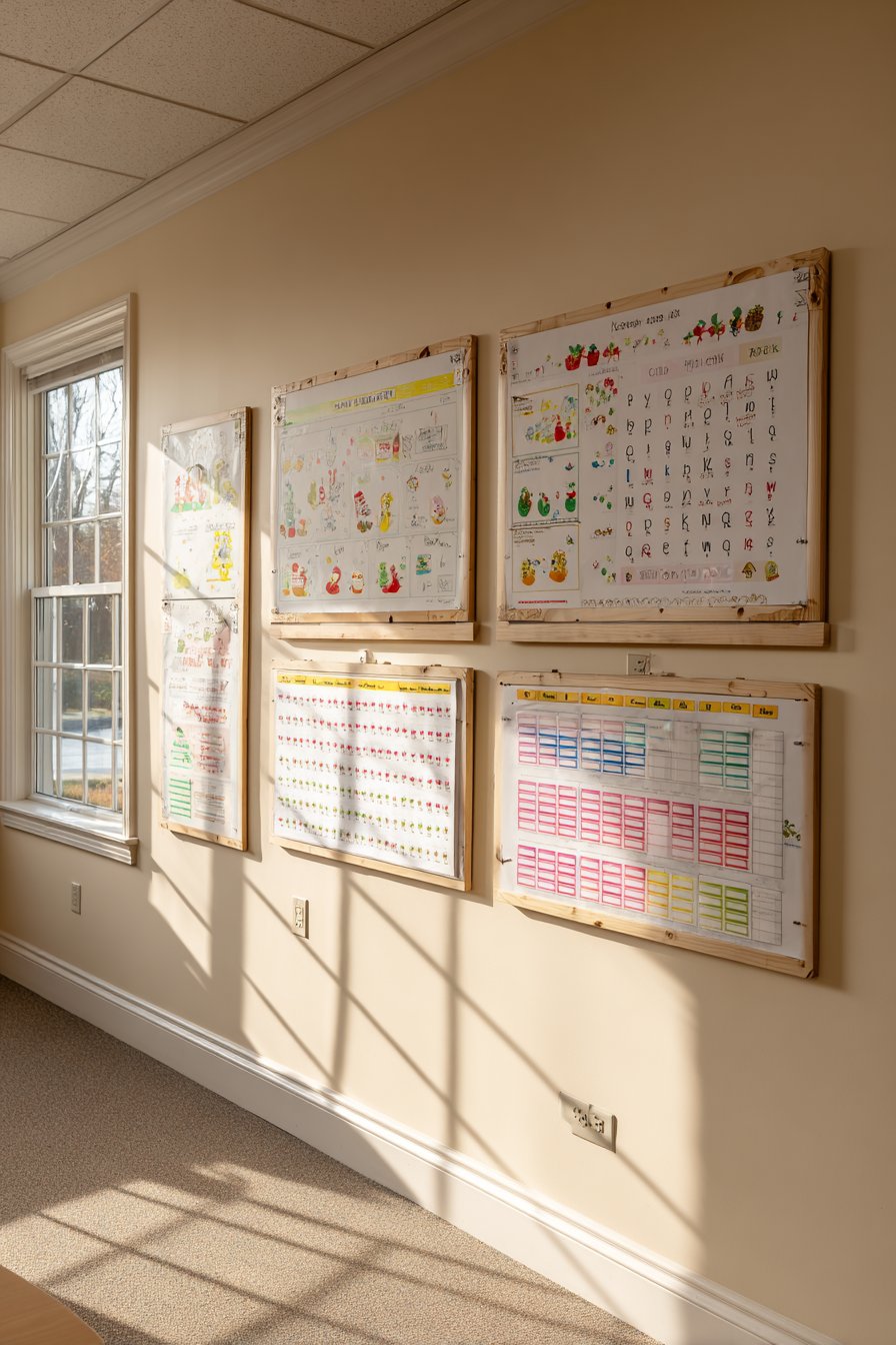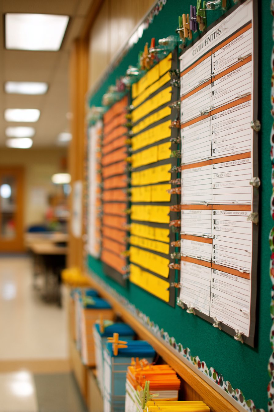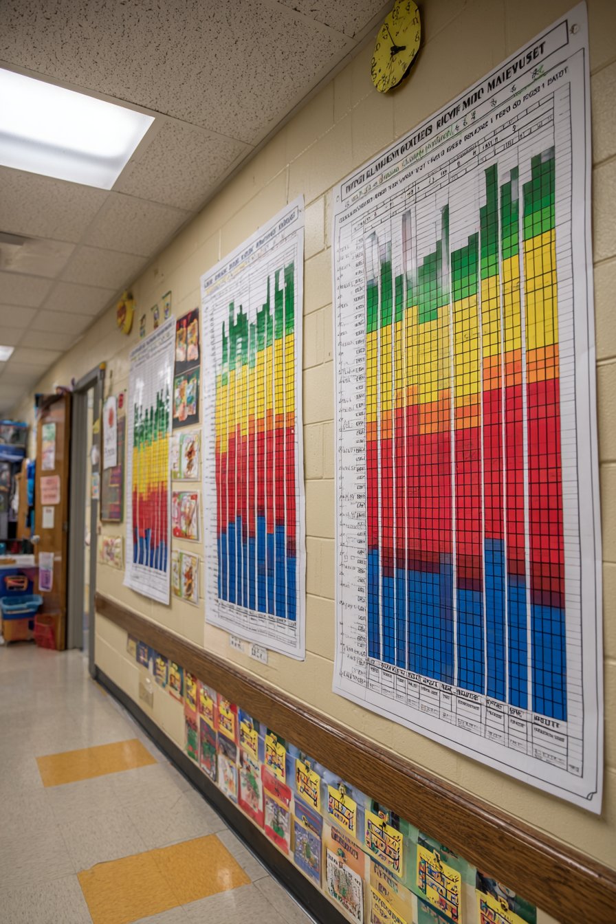 Soft lighting prevents glare on plastic chart protectors while maintaining clear visibility of data and progress indicators. The motivational tracking system serves multiple purposes—it helps students visualize their own growth over time, creates accountability for working toward specific goals, provides teachers with at-a-glance information about class progress, and communicates to families that learning outcomes are carefully monitored and celebrated. The organized data visualization teaches students that progress can be measured, tracked, and celebrated in concrete ways.