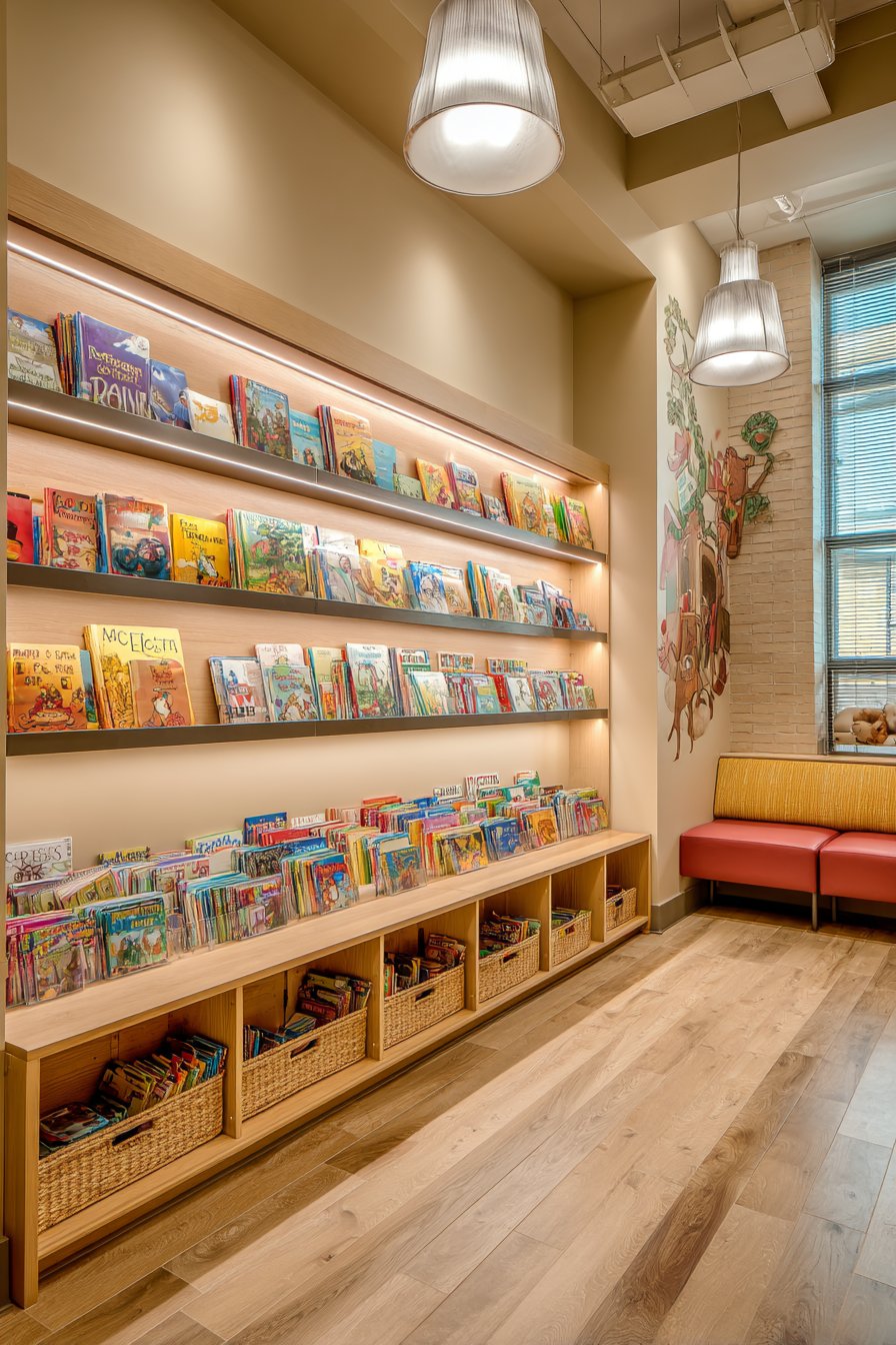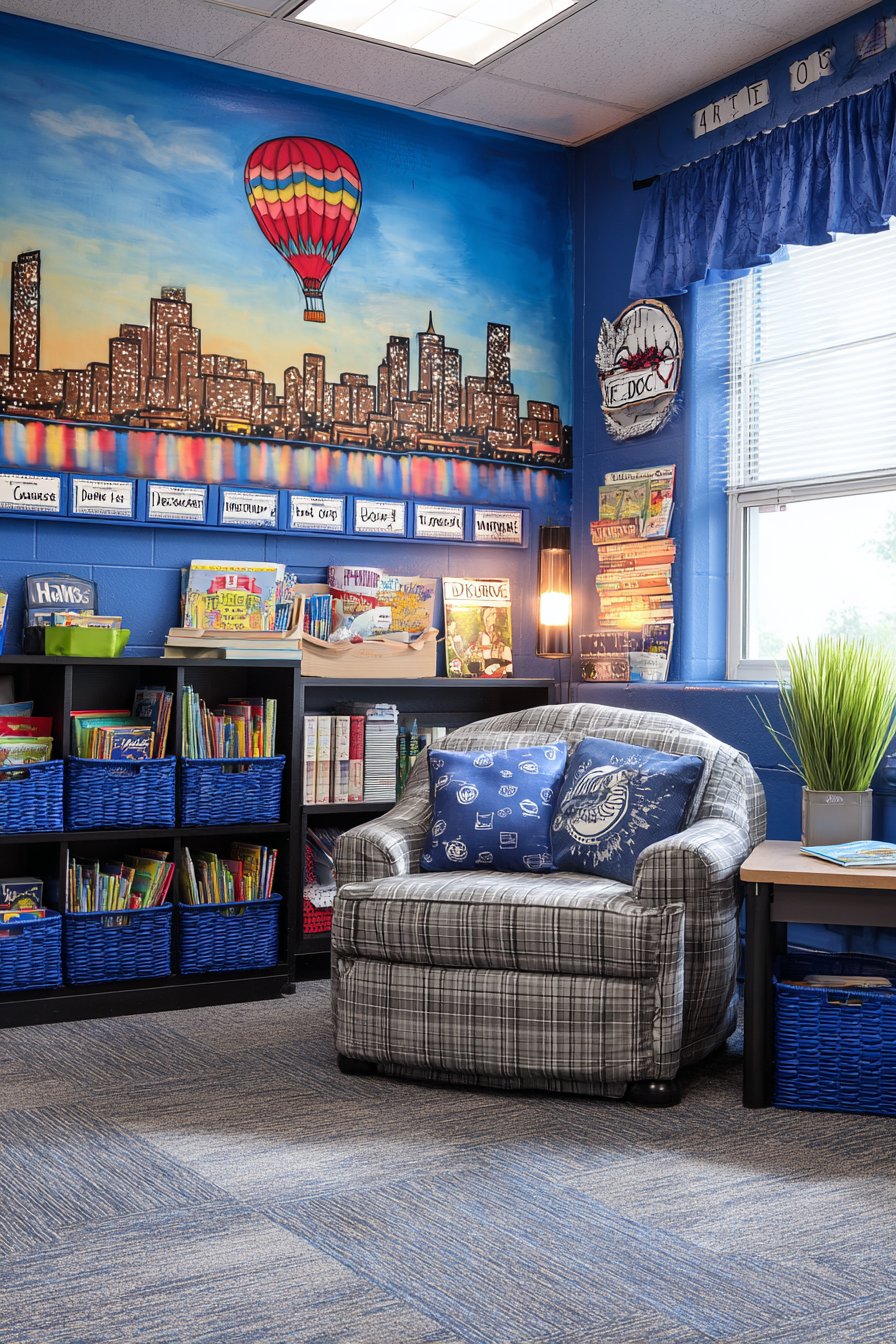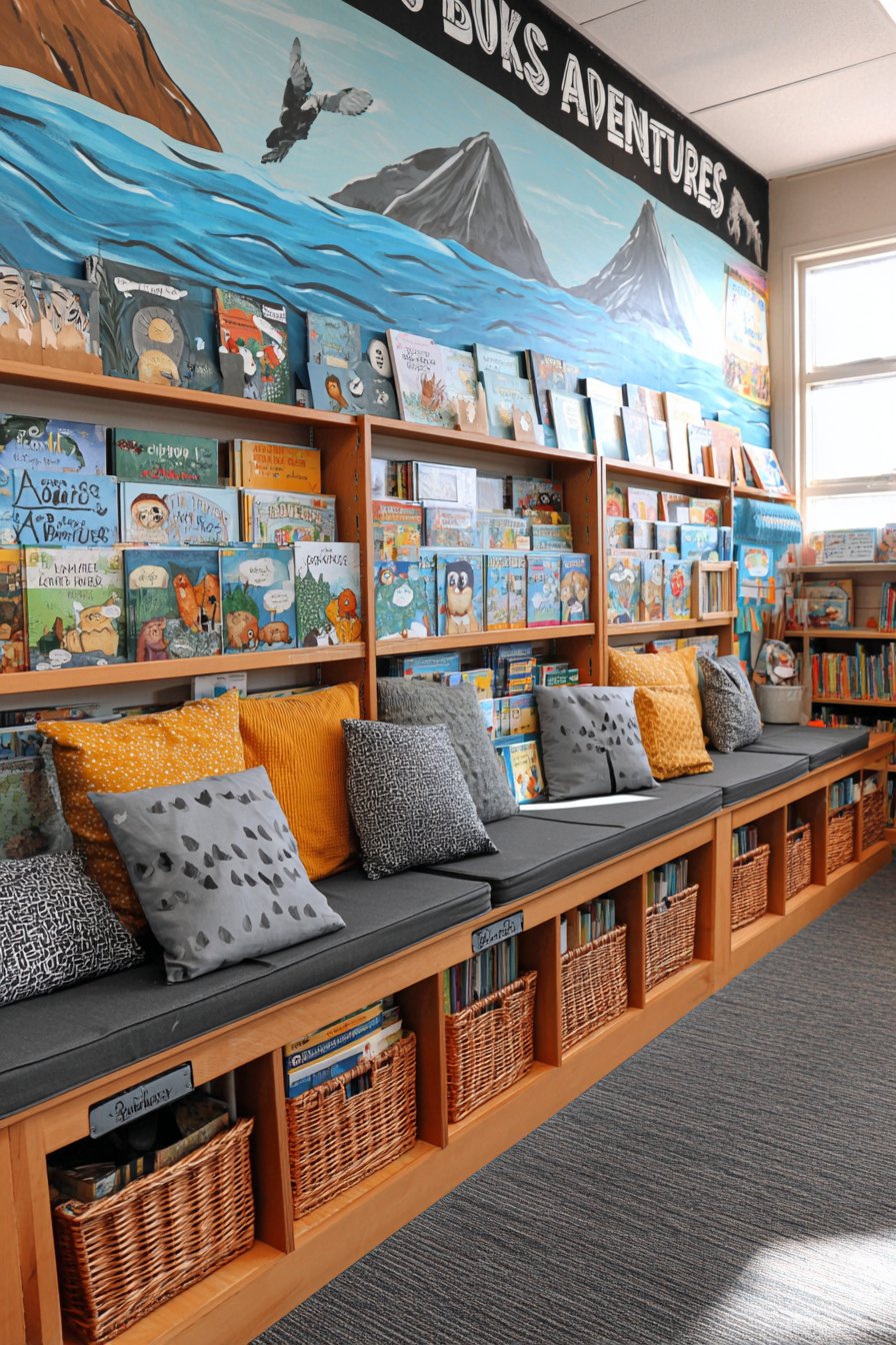 Soft overhead classroom lighting creates an inviting atmosphere that beckons students to curl up with a good book, while the strategic wall decoration serves constant instructional purposes—reinforcing genre characteristics, modeling book recommendation strategies, and celebrating reading accomplishment. The integration with the physical classroom library, where wall-mounted book display shelves showcase covers facing forward with coordinating basket organization below, creates a comprehensive literacy environment where every element supports the development of lifelong readers.