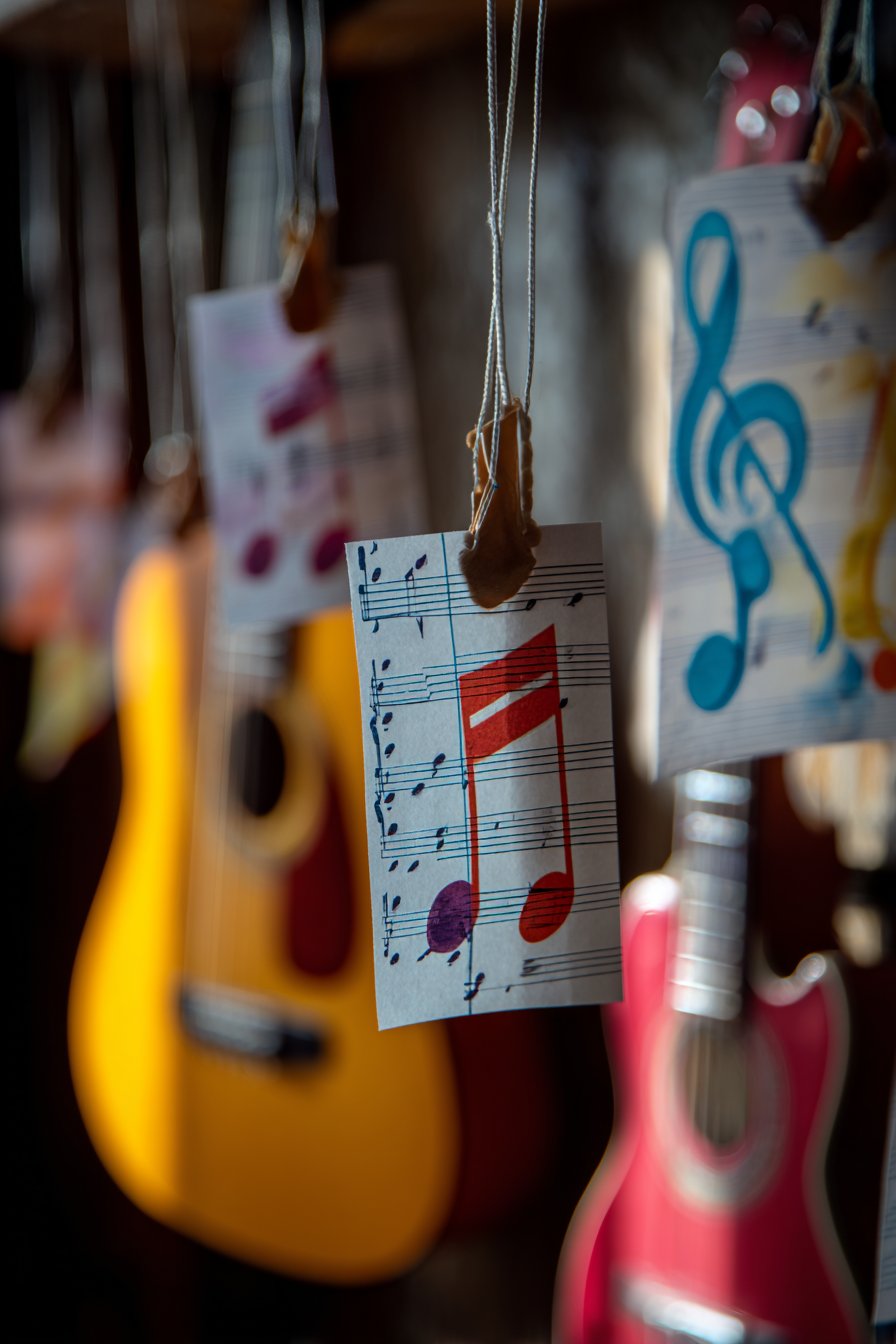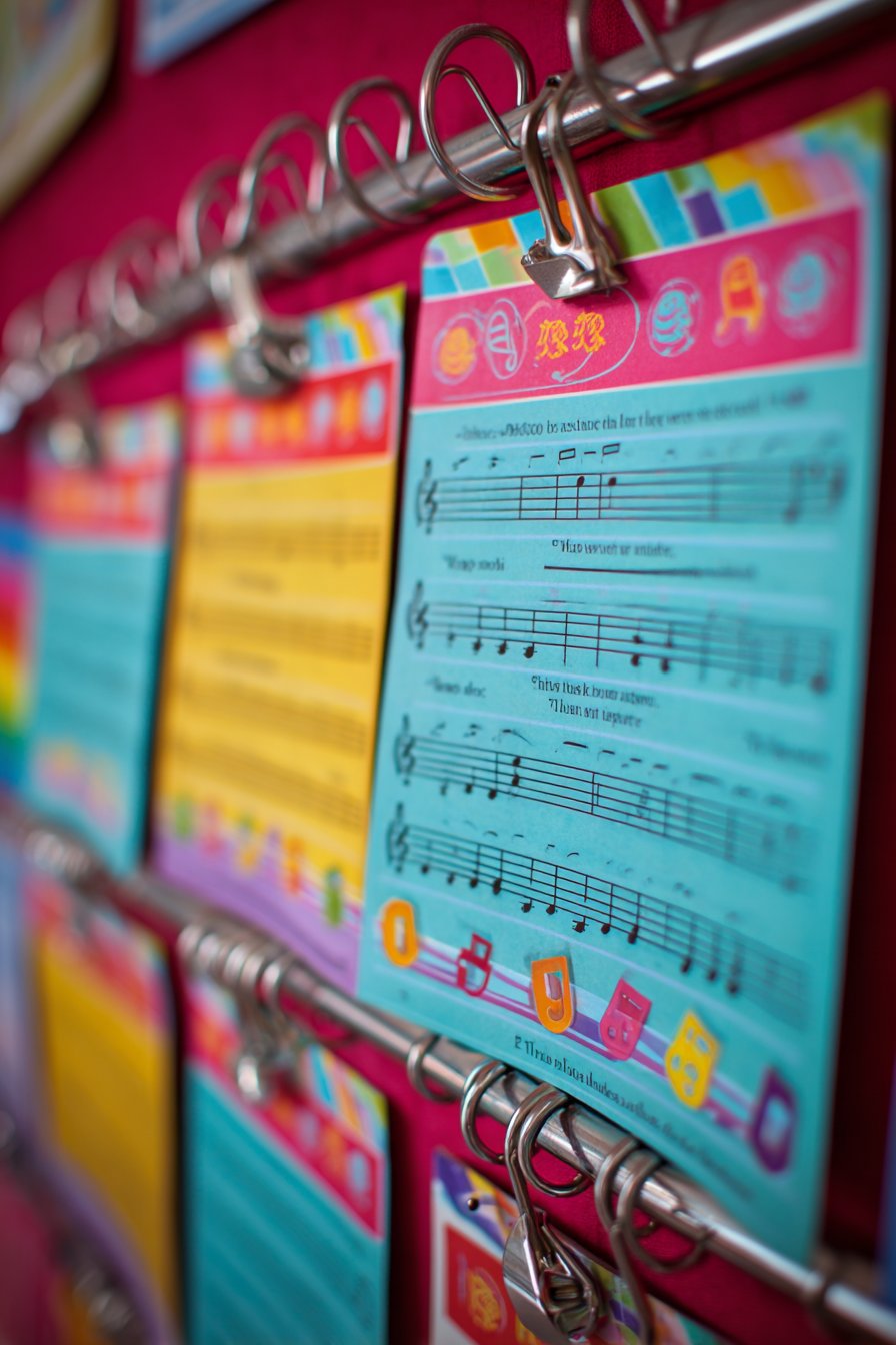 Balanced lighting ensures clear visibility of musical notation—important for students learning to read music—while the creative presentation celebrates the joy and importance of musical expression in educational settings. The combination of theoretical knowledge (note reading, rhythm patterns) with practical application (song lyrics, movement instructions) creates comprehensive musical learning support. The interactive elements—moveable rhythm cards, flip charts of songs—encourage active engagement rather than passive viewing.