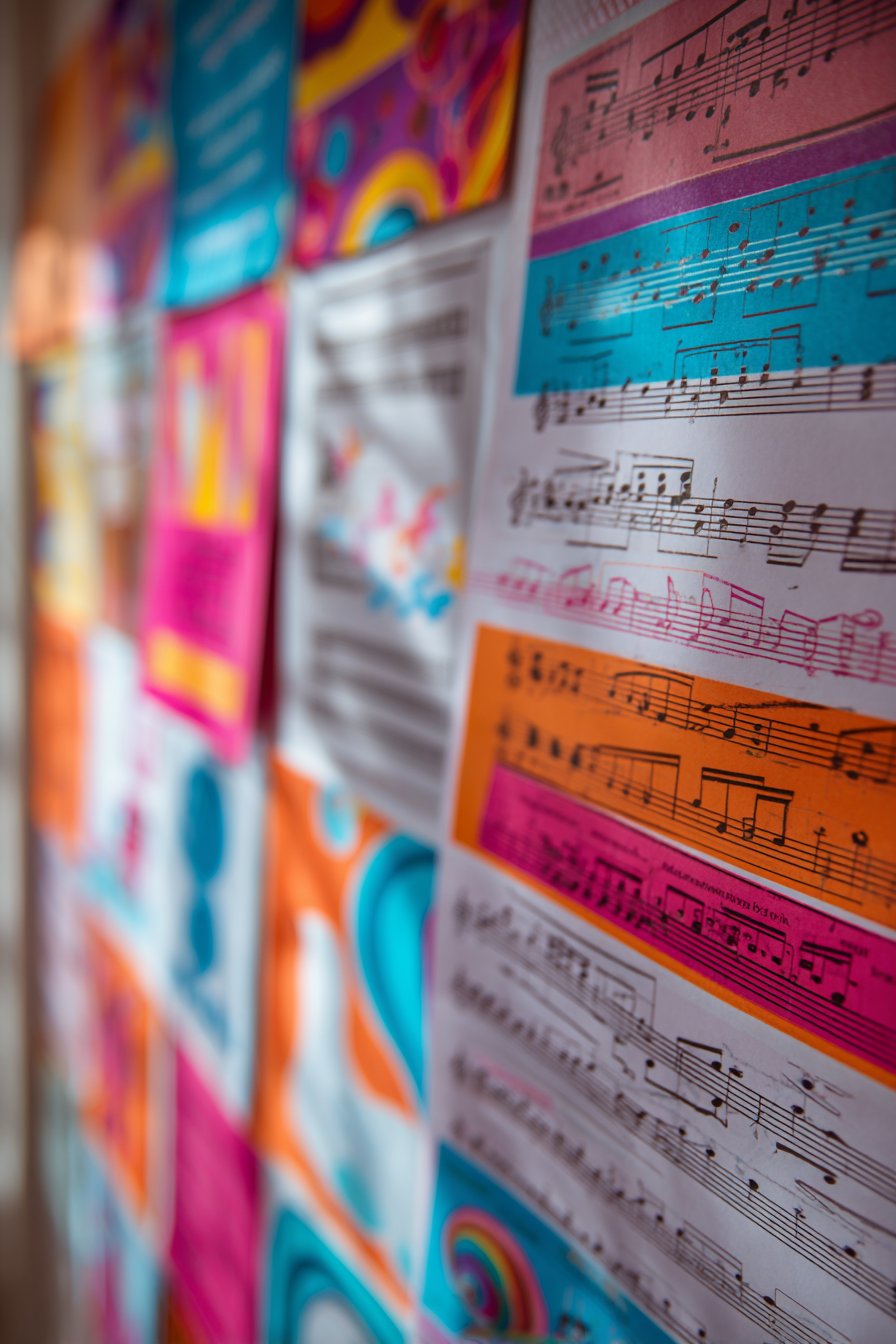Integrating creative arts into the classroom environment, a music and movement display creates visual support for musical learning while celebrating this essential aspect of complete education. This vibrant installation features rhythm pattern posters demonstrating various beat combinations, musical note identification charts teaching staff notation and note values, and lyrics to classroom songs with illustrated hand motions that support kinesthetic learning and memorization. The colorful arrangement employs musical staff backgrounds and instrument silhouettes that create thematic coherence while laminated song sheets in binder rings allow easy flipping during group singing or music time.