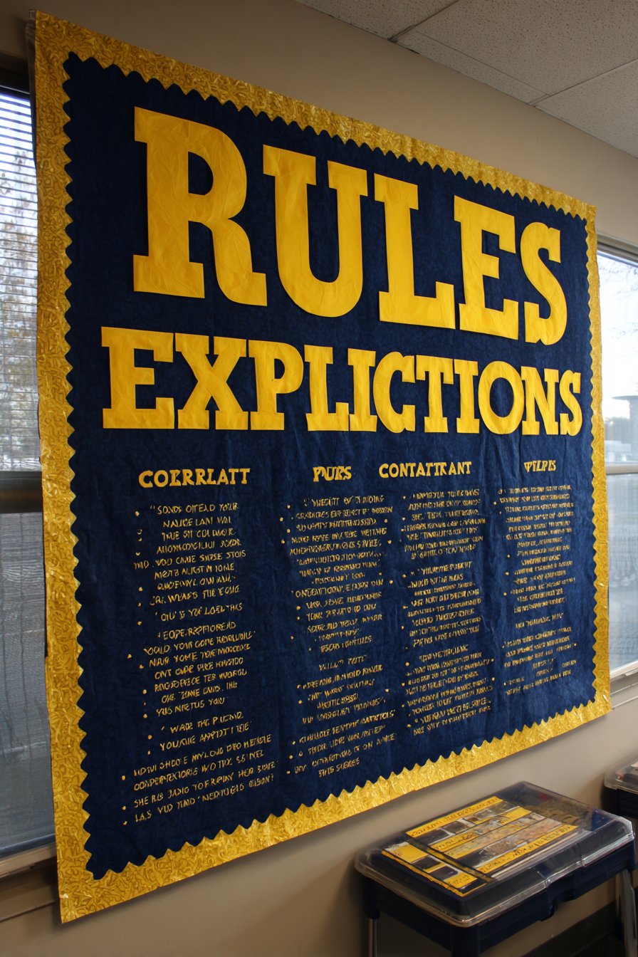 Establishing clear behavioral framework from day one, a classroom rules and expectations display creates visual reference for the norms and values governing the learning community. This foundational installation features positively-worded guidelines focusing on desired behaviors rather than prohibitions, illustrated examples demonstrating what desired behaviors look like in various contexts, and a collaborative class contract signed by all students creating shared ownership and accountability. The presentation employs large, bold lettering with complementary clipart and a cohesive color scheme of navy and yellow that creates professional appearance while maintaining visual accessibility.