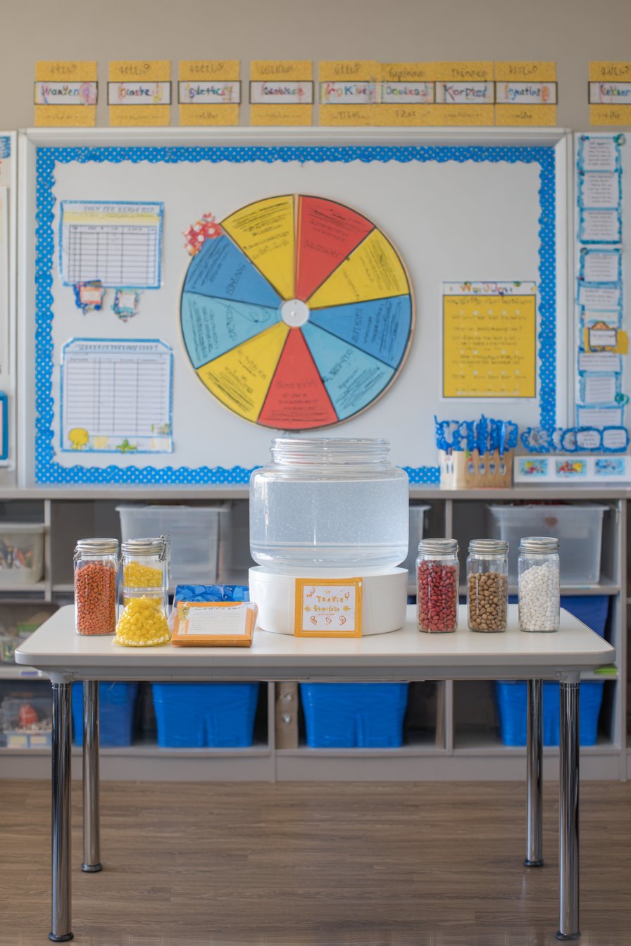 Even classroom lighting ensures all jobs are clearly visible regardless of their position on the rotation wheel, while the organized system creates predictability and fairness that students can understand and trust. The visual task lists support independence—students can check what their job requires without asking the teacher—while the systematic rotation ensures everyone experiences various responsibilities throughout the year. The teamwork theme frames classroom maintenance as collaborative community work rather than individual chores.