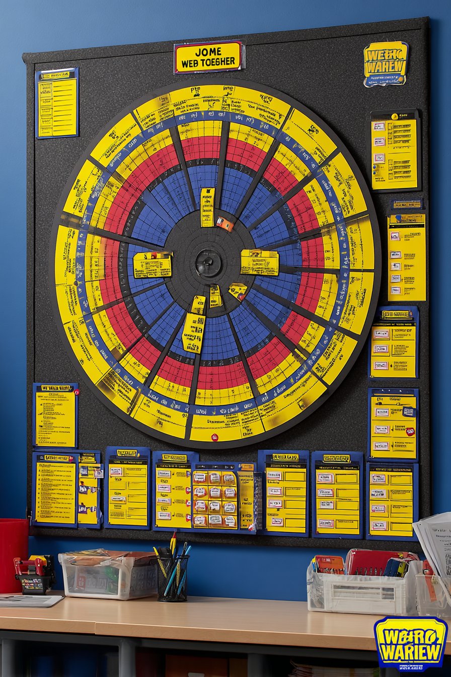 Building community responsibility through visual organization, a classroom helper schedule creates transparent systems for distributing daily tasks while teaching workplace skills. This functional display features a rotating job wheel chart where student names move through various positions, detailed job descriptions with visual task lists ensuring clarity about responsibilities, and a “We Work Together” theme with teamwork graphics reinforcing collaborative values. The interactive display uses moveable student name tags and clear responsibility cards while bright primary colors create visual appeal without overwhelming.
