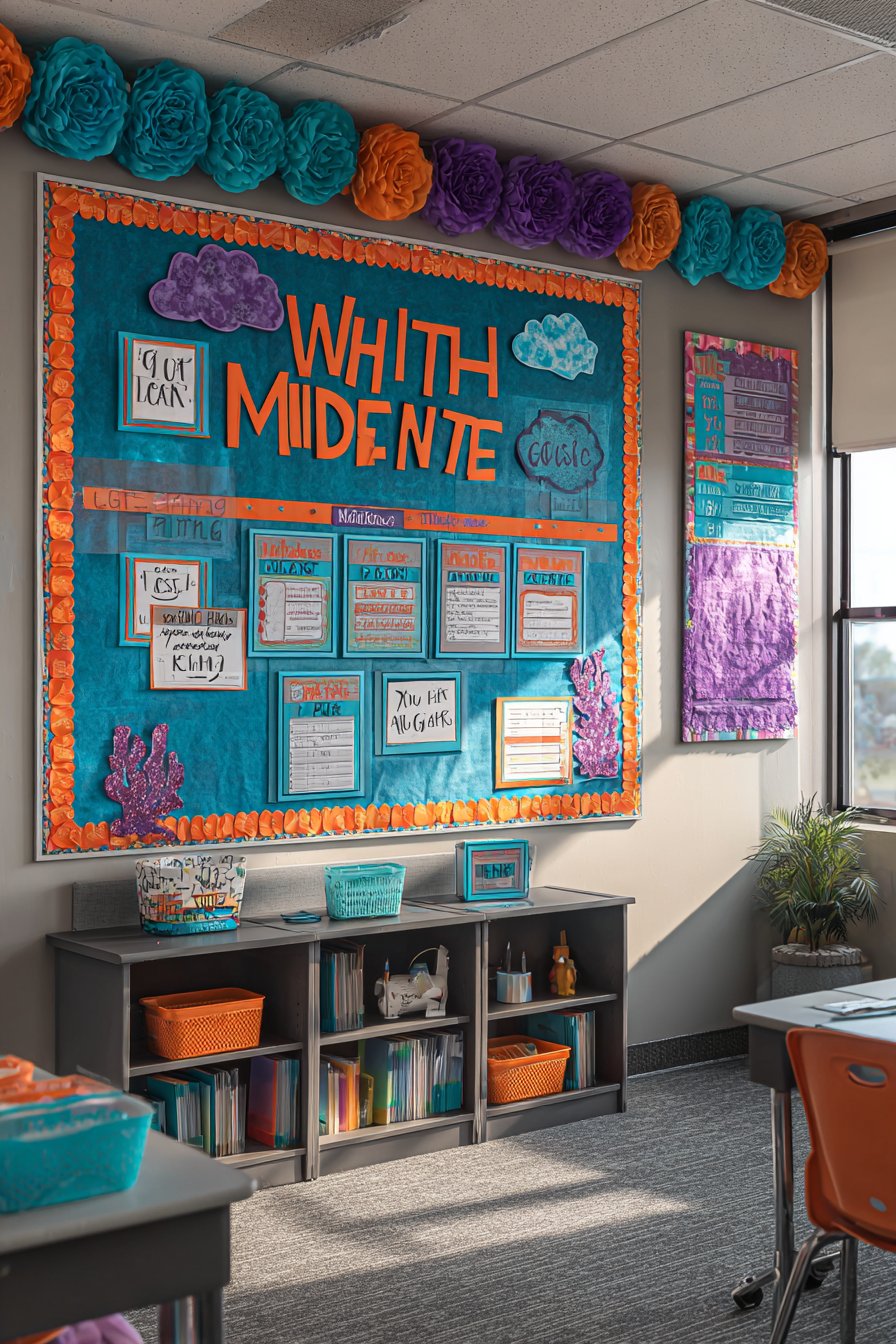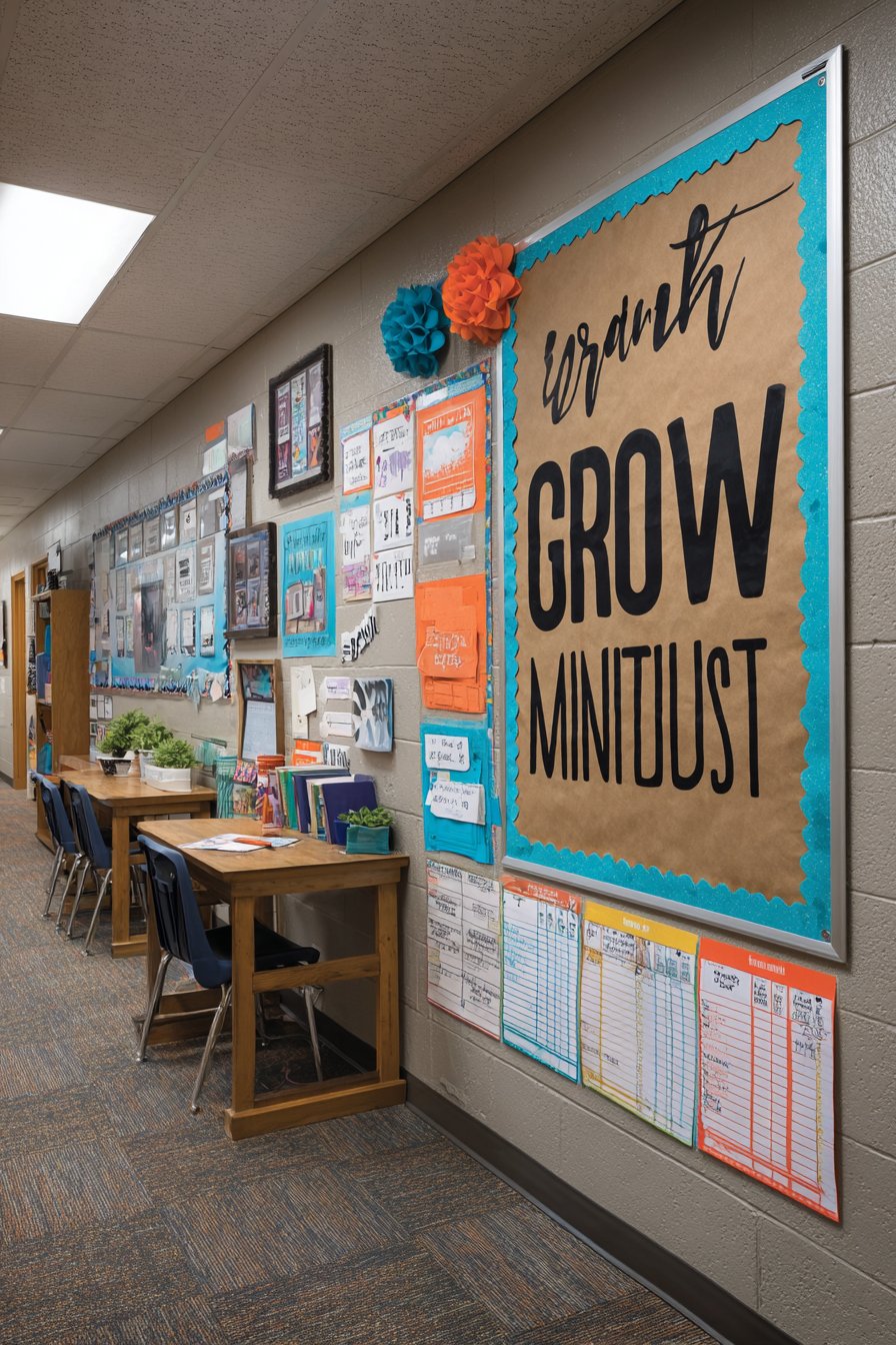 Creating a dedicated space for motivational messaging transforms classroom walls into daily sources of encouragement and resilience-building. This growth mindset inspiration station features hand-lettered typography on kraft paper backgrounds, creating an authentic, handcrafted aesthetic that feels personal and intentional. The bulletin board thoughtfully combines inspirational quotes about learning, persistence, and self-belief with student goal-setting sheets where learners articulate their academic and personal aspirations. Colorful border trim in coordinating teal and orange hues creates visual excitement while framing the motivational content in a cohesive, professional manner.