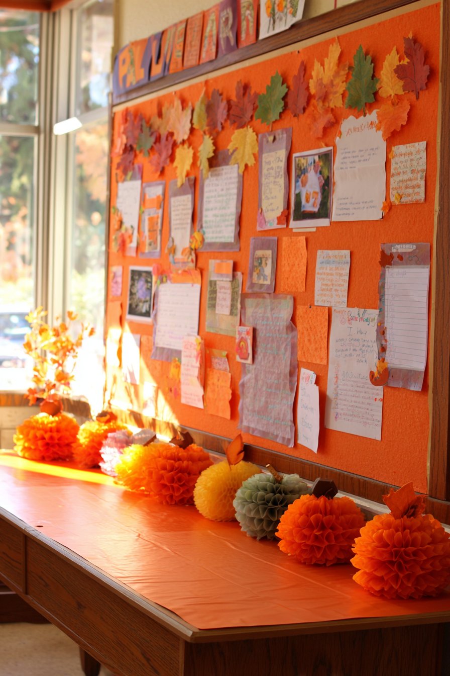 Connecting classroom learning to the natural world and seasonal changes creates relevance and excitement that can reenergize curriculum throughout the school year. This autumn-themed bulletin board features meticulously crafted paper leaf cutouts in harvest colors—deep oranges, golden yellows, and rich browns—that bring the beauty of fall indoors. Student writing projects mounted on warm orange background paper showcase seasonal narratives, descriptive paragraphs, or informational texts about autumn phenomena, connecting creative expression with observational learning. Three-dimensional pumpkin decorations constructed from layered construction paper add sculptural interest and demonstrate how simple materials can create impressive visual impact.