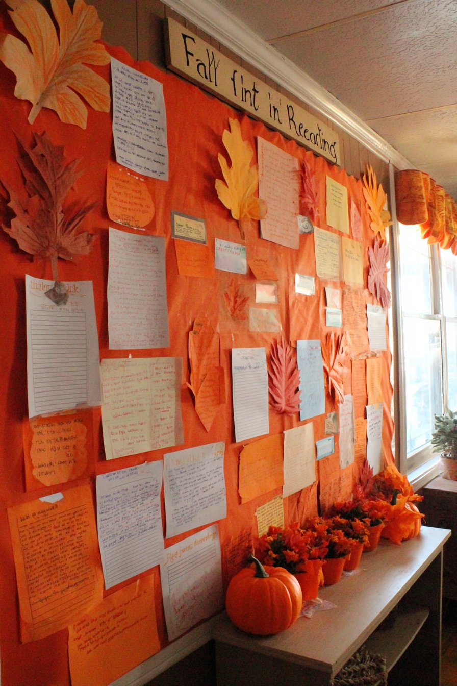 The “Fall Into Reading” header employs decorative letters that playfully reference the season while reinforcing literacy messages, creating a cohesive theme that ties visual aesthetics to educational objectives. Natural window light creates gentle highlights on the varied textures of construction paper, tissue paper, and writing paper, adding depth and visual interest throughout the day. The seasonal rotation of this display—transitioning from autumn to winter, spring, and summer—maintains novelty and connects classroom learning to students’ lived experiences of changing seasons.