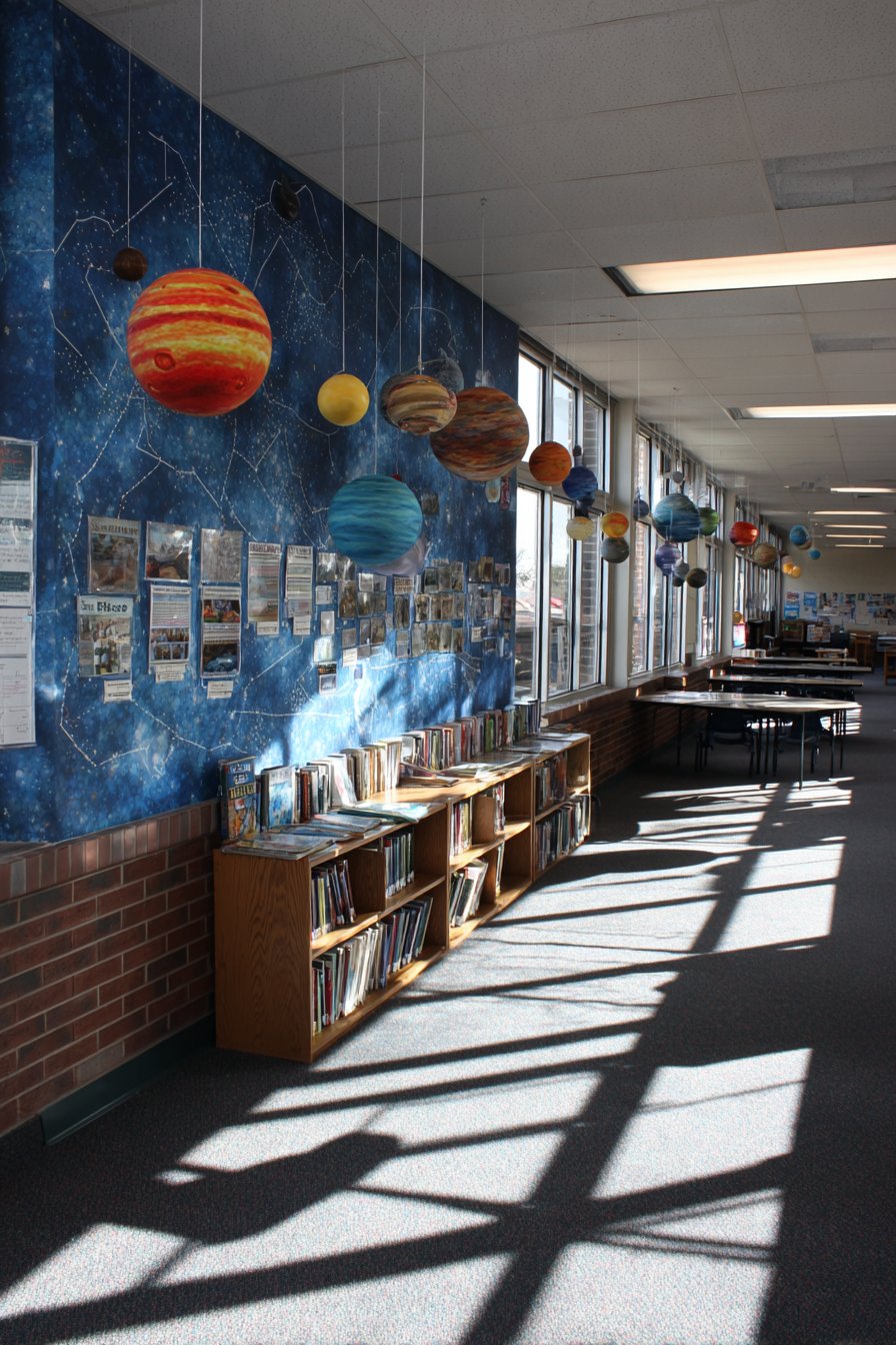 Display shelving positioned beneath the celestial installation holds student science projects, reference books, and scientific tools, creating a comprehensive science corner that encourages exploration and independent investigation. Classroom lighting deliberately creates dramatic shadows that enhance the space theme, with careful positioning ensuring that the three-dimensional planets cast realistic shadows similar to how celestial bodies appear in astronomical photography. The combination of visual impact and educational content makes this display equally effective for whole-class instruction, small group exploration, and individual student reference.