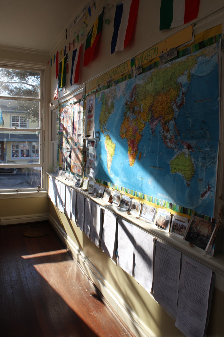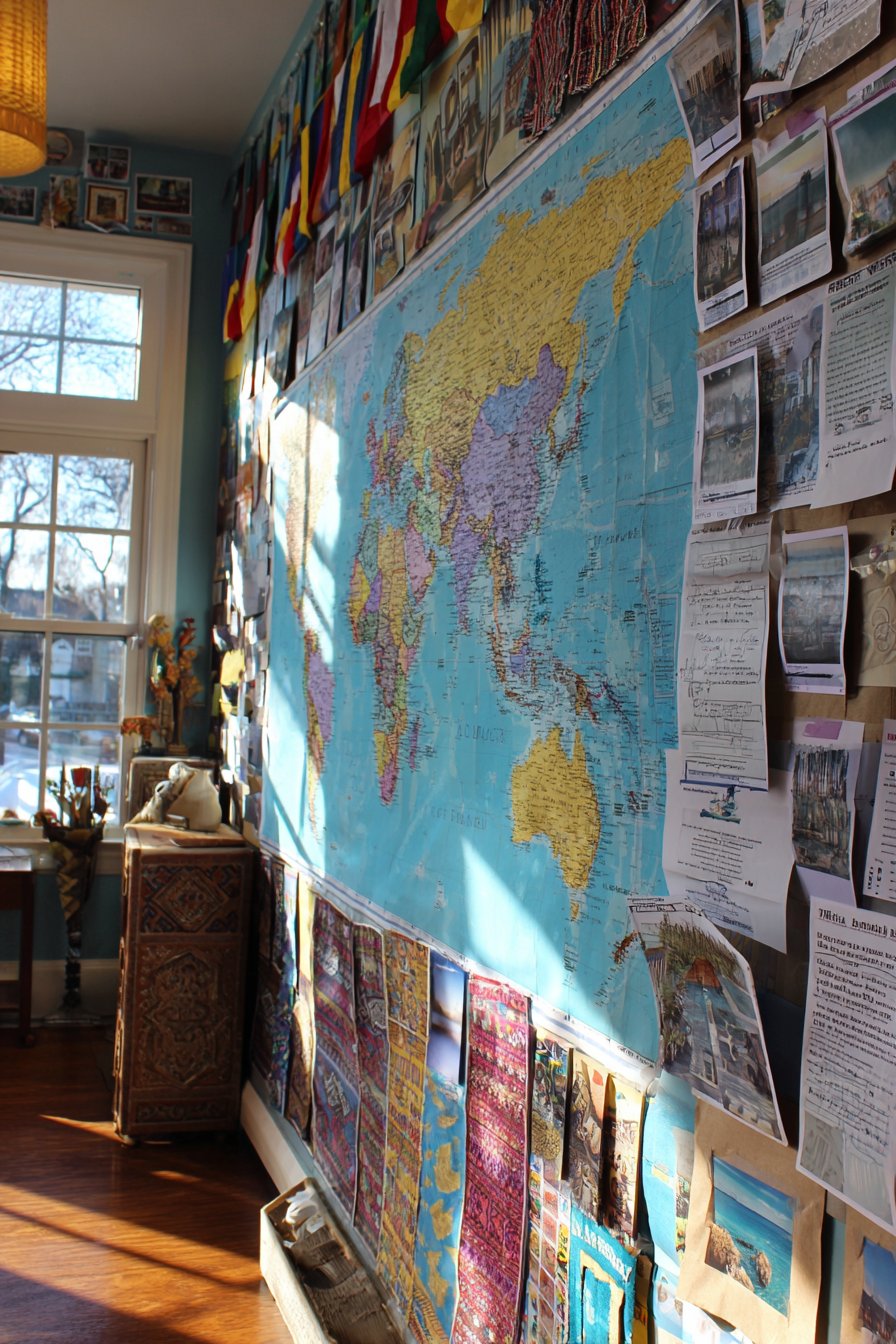The “Global Citizens” header rendered in bold block letters establishes the thematic framework while communicating high expectations for students’ developing understanding of international interconnectedness. Natural lighting from adjacent windows illuminates the interactive geography wall throughout the day, creating an inviting space for individual exploration or small group discussions. The combination of tactile elements (students can touch the map, add new pins, arrange artifacts) with visual learning (flags, images, colors) and textual information (research reports, country facts) creates a multisensory learning experience.
