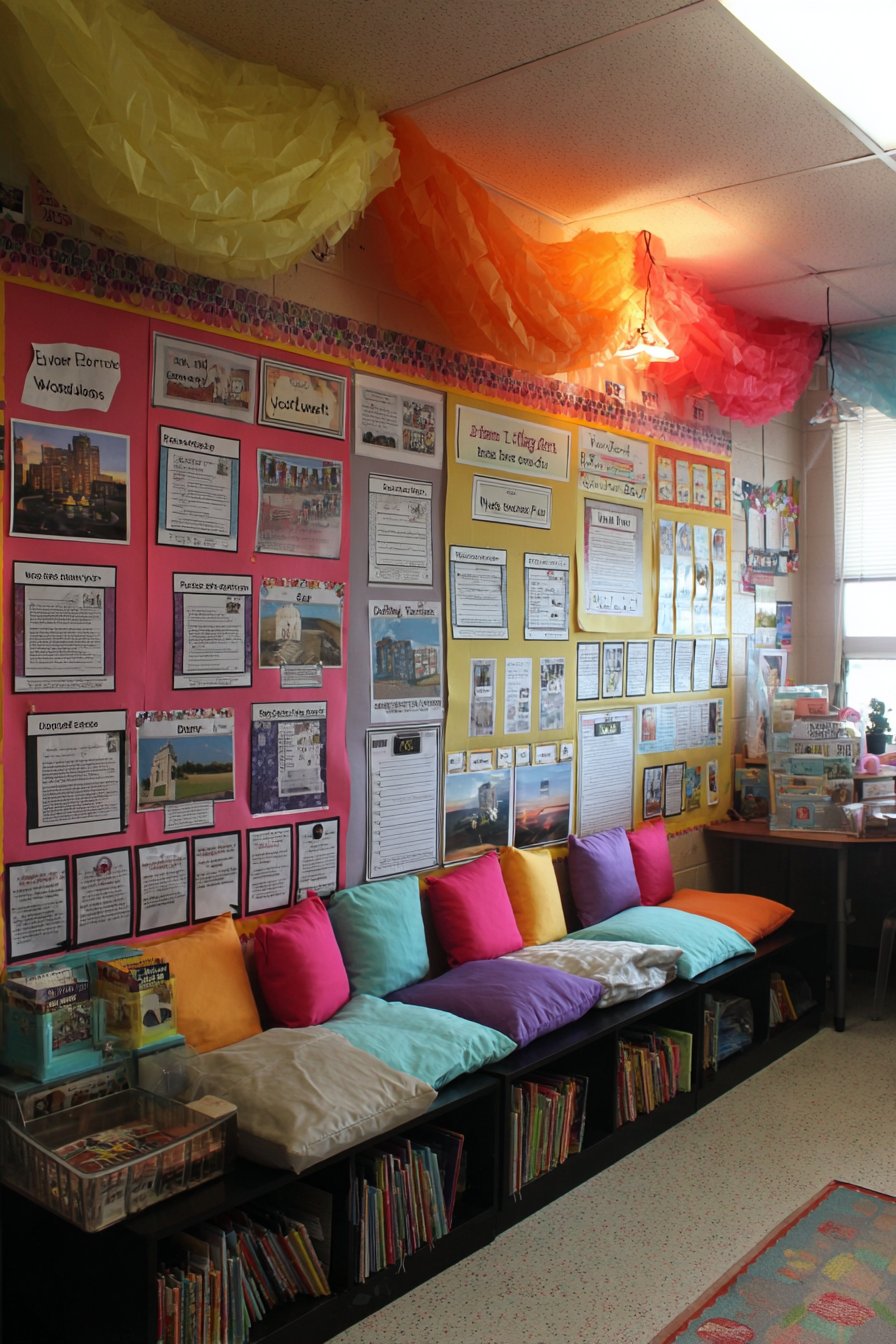 Creating a dedicated space that celebrates reading and literacy transforms classroom walls into gateways to literary adventures. This comprehensive literacy center features book recommendation posters where students advocate for favorite titles, genre classification charts that help young readers navigate the library, and a “Reading Hall of Fame” displaying student photos alongside their book reviews and reading achievements. The arrangement utilizes colorful fabric panels as backing material, adding softness and visual warmth while coordinating ribbon borders create structured sections within the larger display.