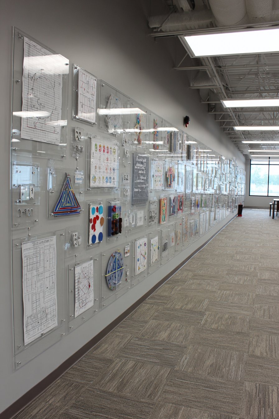 Transforming abstract mathematical concepts into visually accessible learning tools, a STEM-focused wall display creates constant reference materials that support numerical literacy and computational thinking. This installation features number lines demonstrating various mathematical relationships, geometric shape posters illustrating properties and formulas, and problem-solving strategy charts that provide step-by-step frameworks for approaching challenging questions. Clear acrylic holders contain daily math challenges that change regularly, with student solution examples demonstrating various approaches to the same problem.