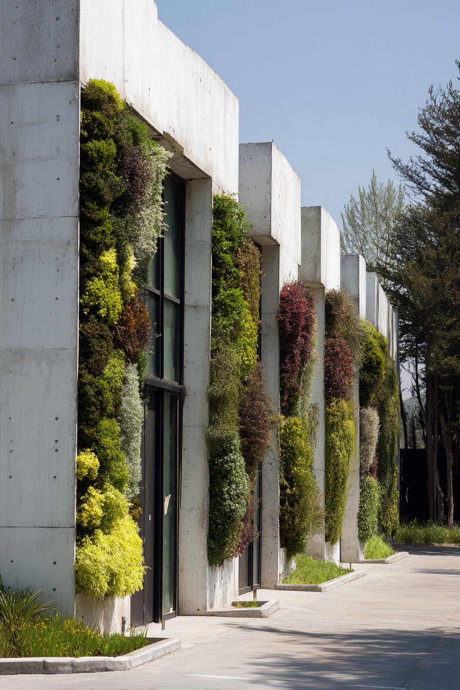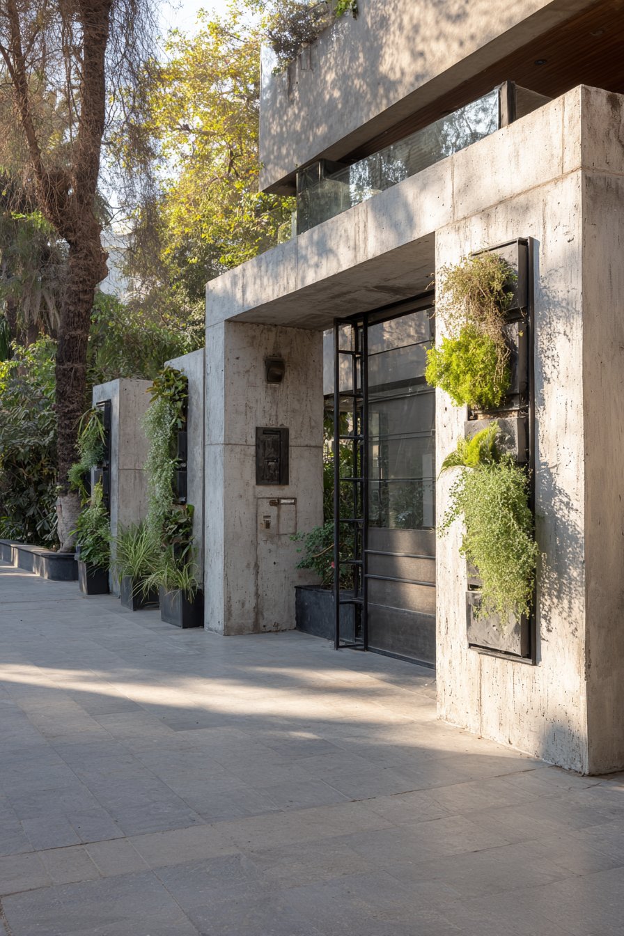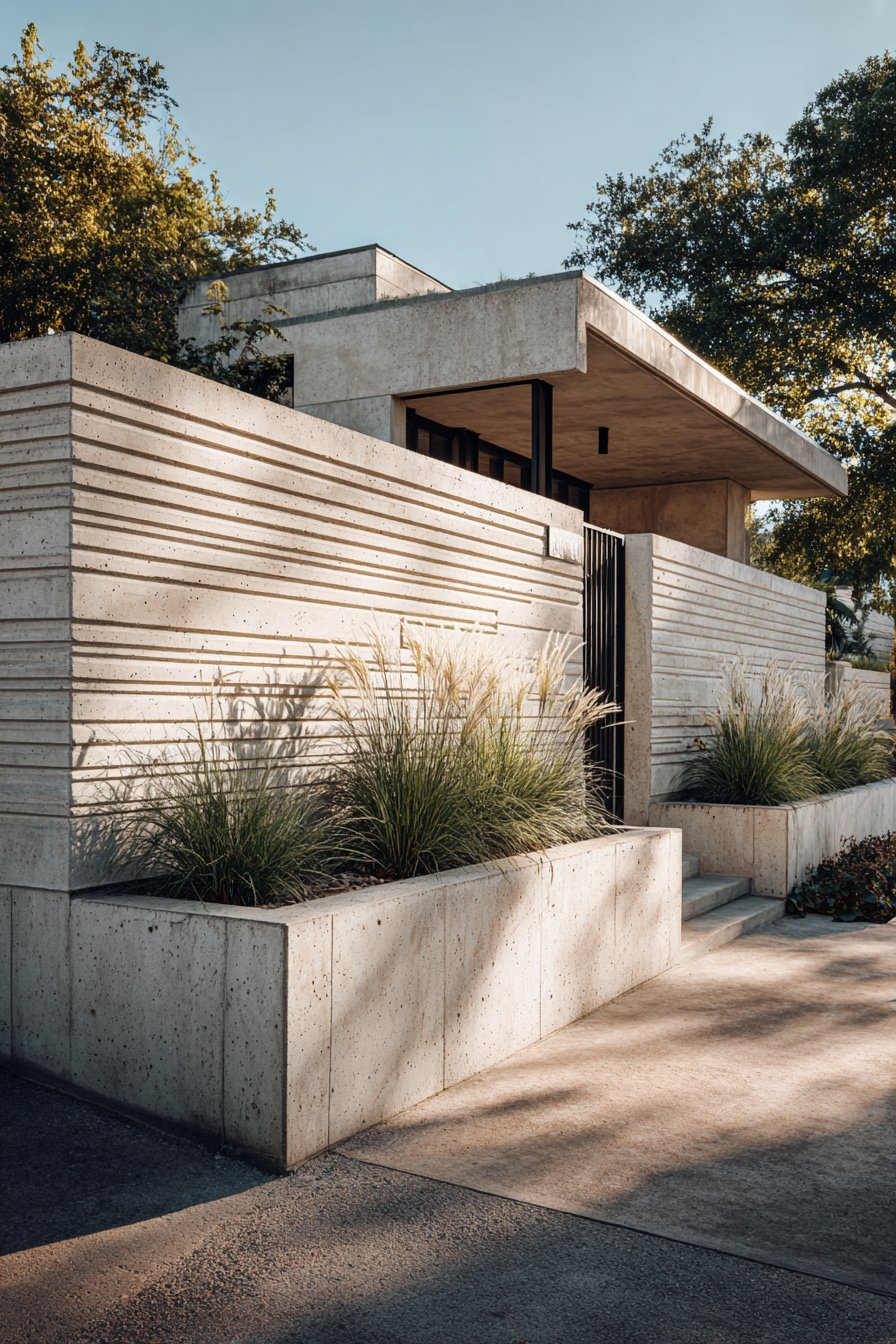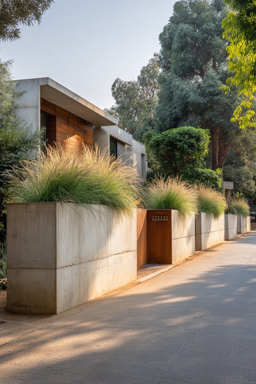 What elevates this design beyond standard rendered walls is the integration of functional elements with aesthetic considerations. Rectangular metal planters positioned at regular intervals break up the wall’s expanse while introducing organic elements through ornamental grasses. These planted sections create rhythm along the wall’s length and soften the industrial character of the cement and metal materials. The grasses move gently with the breeze, adding dynamic movement to the static structure.
