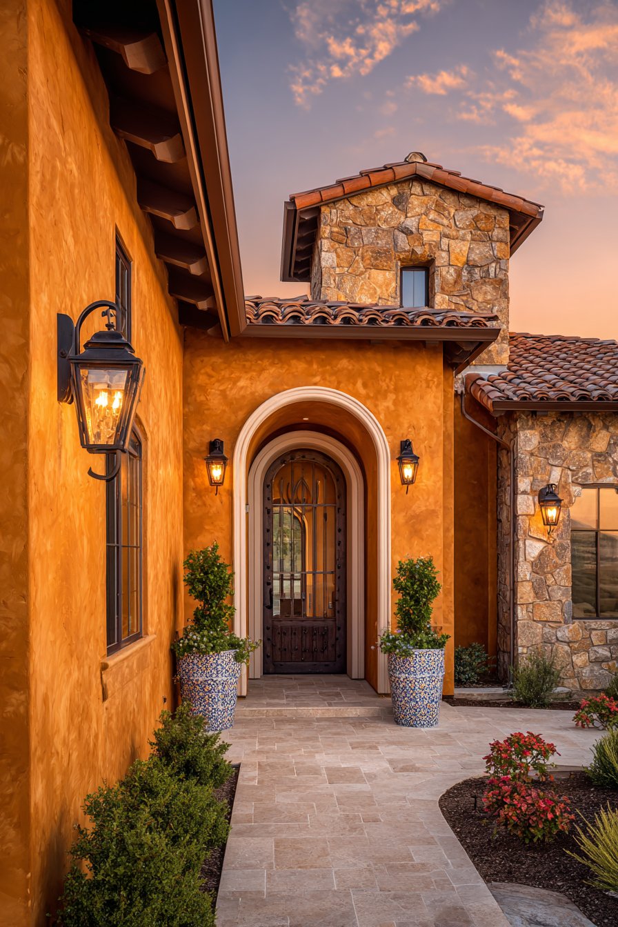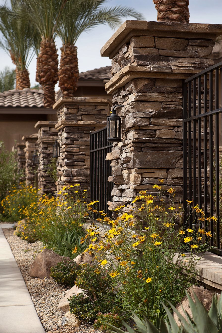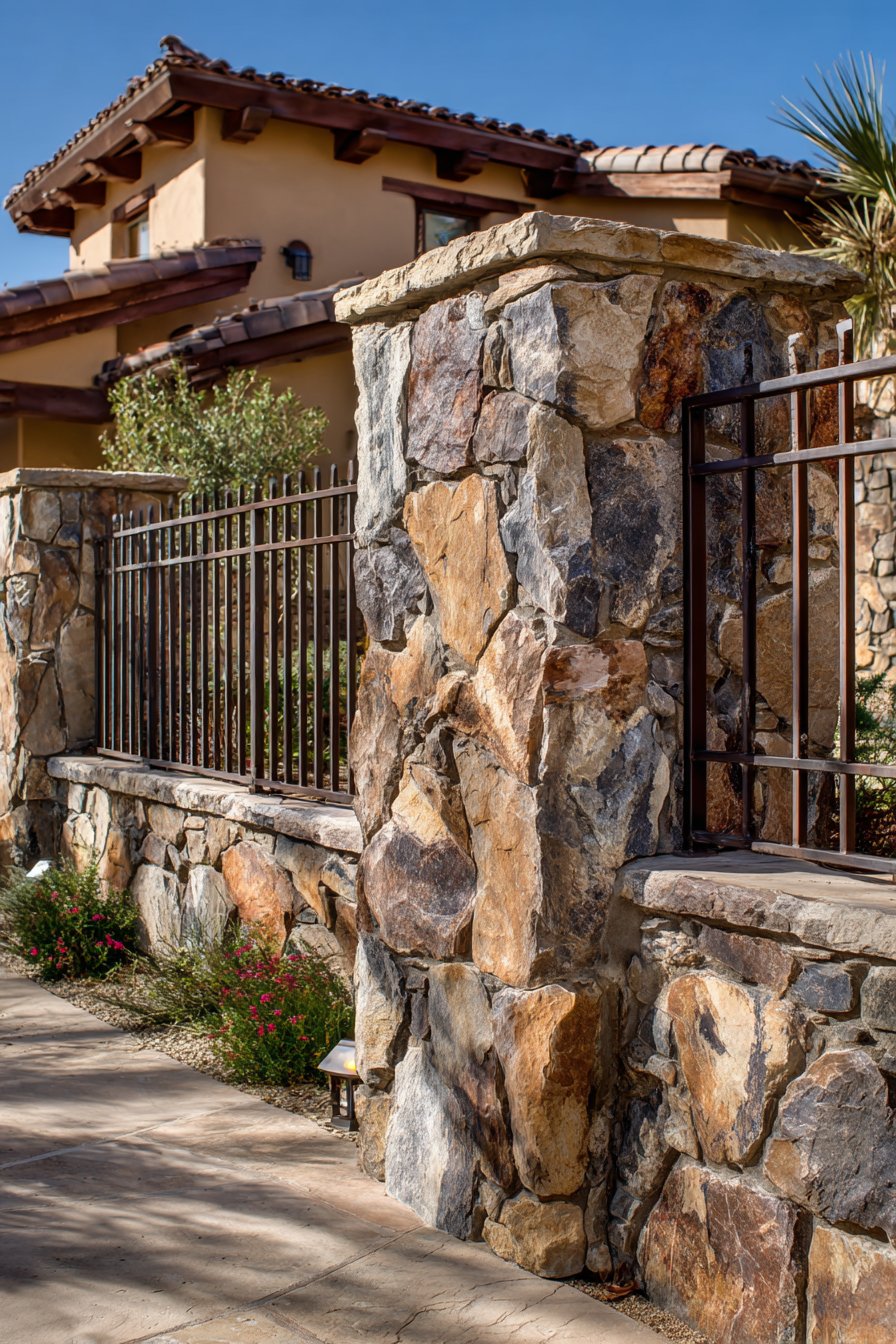 Terracotta tile cap stones provide the finishing touch, protecting the wall top from water penetration while reinforcing the Mediterranean color palette. These semi-cylindrical tiles, laid in overlapping fashion, create distinctive scalloped edges along the wall’s profile and add dimensional shadow lines. Beyond their aesthetic contribution, they provide excellent weather protection, shedding rainwater away from the wall’s core.