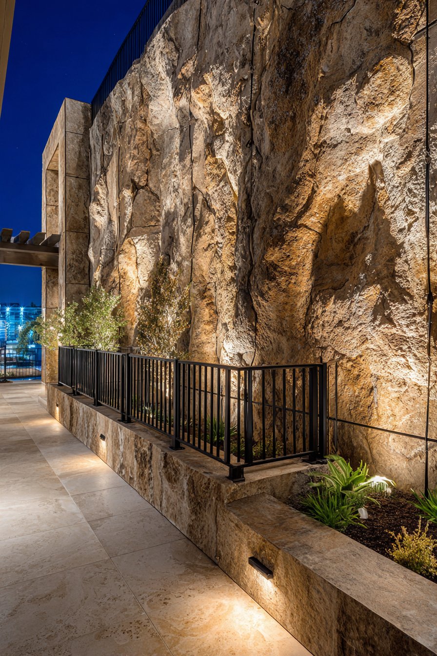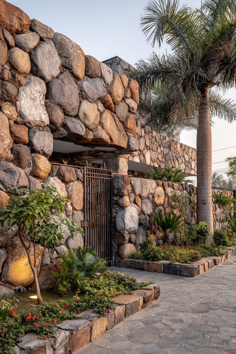 Landscape lighting integrated at the wall’s base serves a dual purpose in this design. Practically, it illuminates pathways and enhances nighttime security by eliminating dark corners where intruders might hide. Aesthetically, the upward-directed light grazes the stone surface, dramatically highlighting the texture and creating deep shadows between individual stones. This nighttime transformation gives the wall an entirely different character after dark, showcasing the three-dimensional quality of the stonework in ways that daylight cannot achieve.