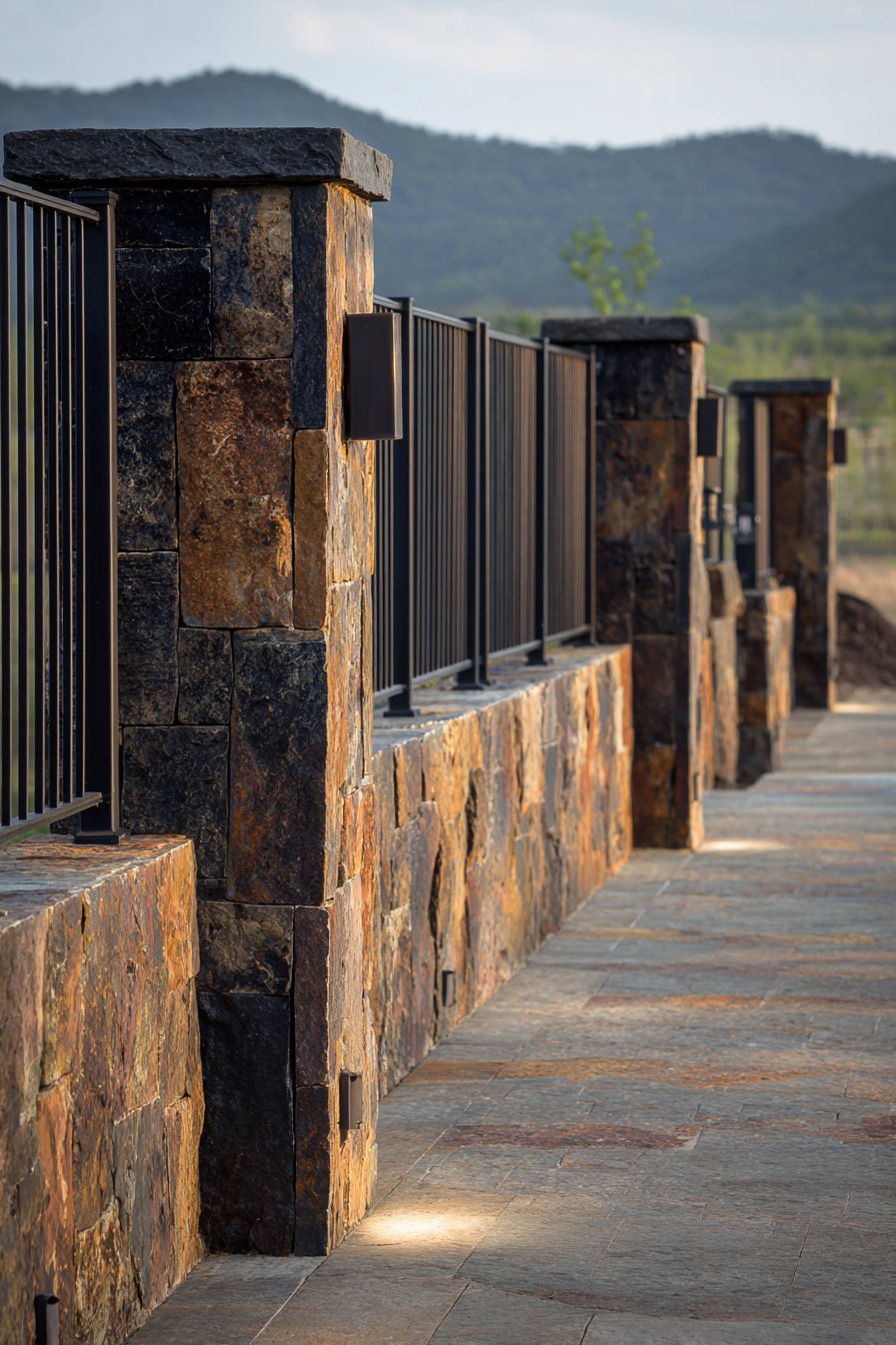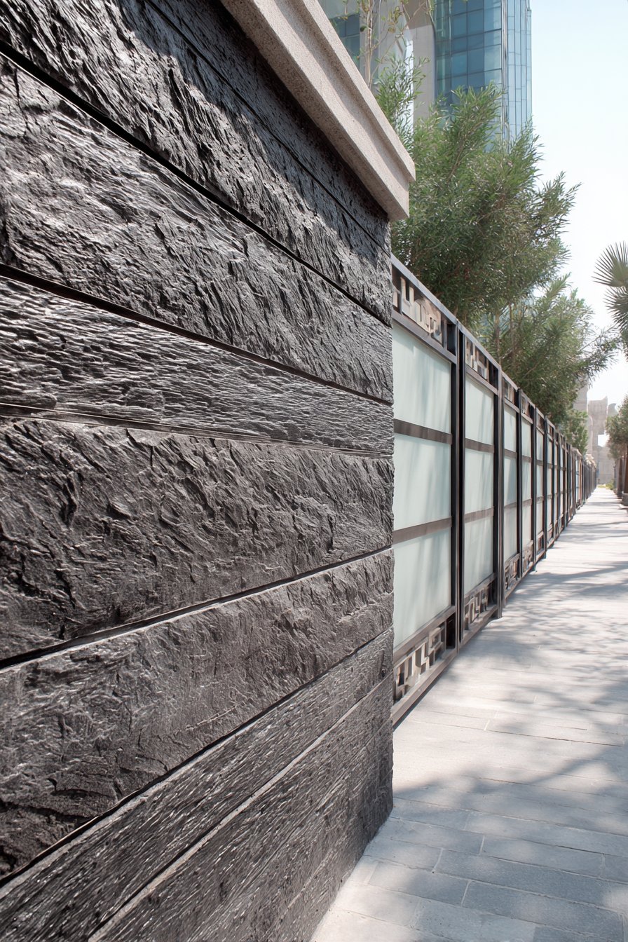 This sophisticated compound wall features slate stone cladding in dark grey to black tones arranged in horizontal courses that create clean contemporary lines. The natural cleft surface—created when slate is split along its natural grain during quarrying—produces dimensional texture that catches light and shadow beautifully. Each slate piece’s slight surface undulation creates visual interest while the horizontal coursing maintains ordered appearance. The dark palette creates dramatic presence that commands attention while maintaining elegant restraint appropriate for residential boundaries.