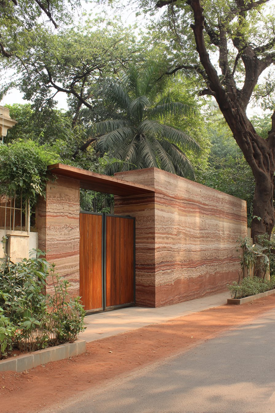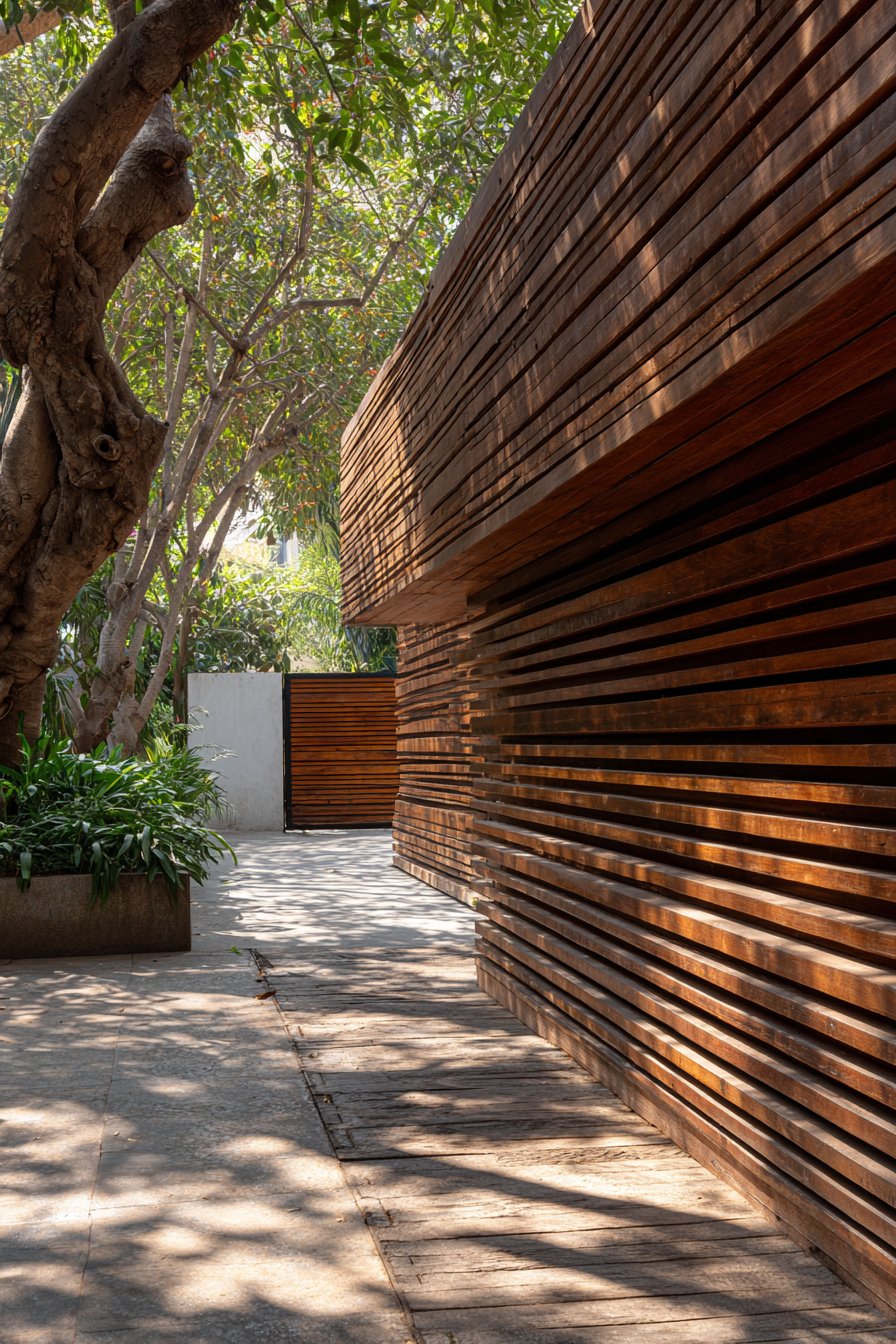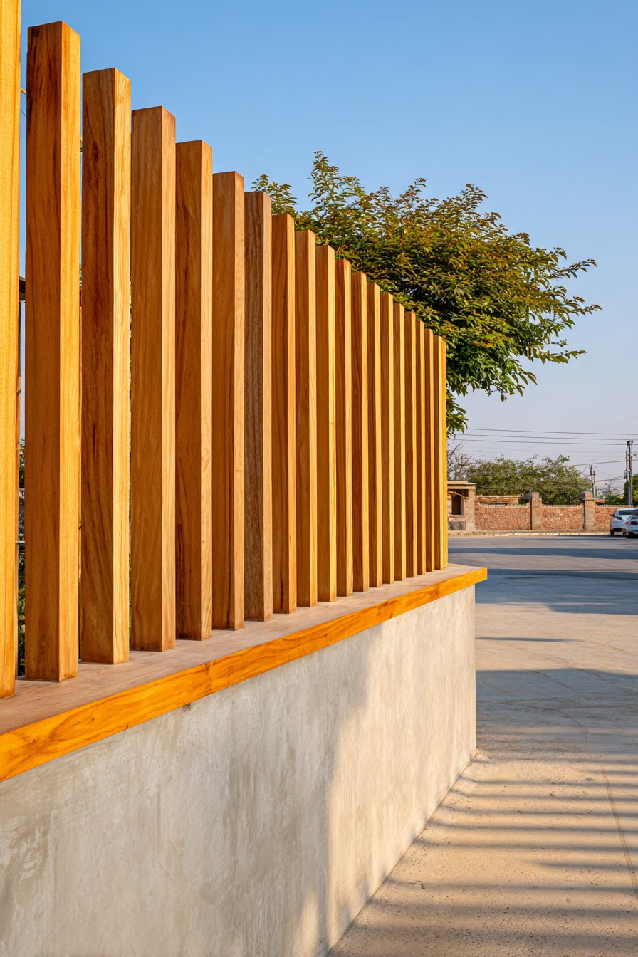 This contemporary compound wall design demonstrates how natural materials can be deployed in modern compositions to create privacy without complete visual barrier. Vertical wooden slats in natural teak finish are mounted on a solid concrete base wall, creating a two-tier composition where the lower concrete portion provides security and the upper slatted section allows light and air passage. The slats are precisely spaced to balance privacy with transparency—close enough to obscure direct views into the property but far enough apart to maintain visual connection with the surrounding environment and create intriguing shadow patterns.