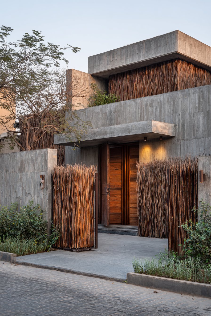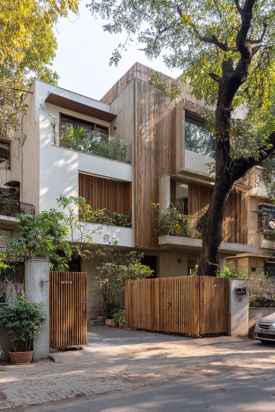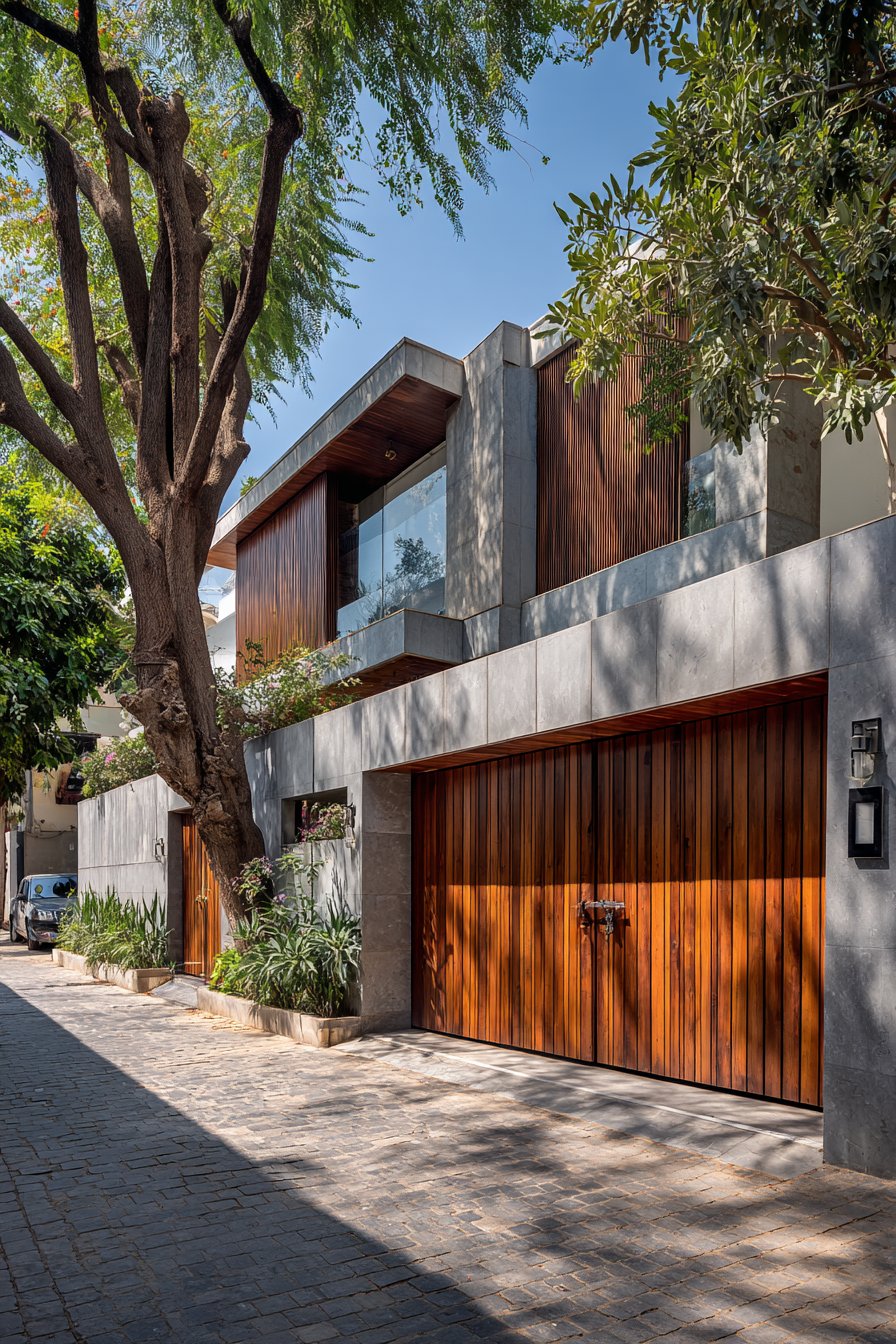 This contemporary compound wall design demonstrates how natural materials can be deployed in modern compositions to create privacy without complete visual barrier. Vertical wooden slats in natural teak finish are mounted on a solid concrete base wall, creating a two-tier composition where the lower concrete portion provides security and the upper slatted section allows light and air passage. The slats are precisely spaced to balance privacy with transparency—close enough to obscure direct views into the property but far enough apart to maintain visual connection with the surrounding environment and create intriguing shadow patterns.