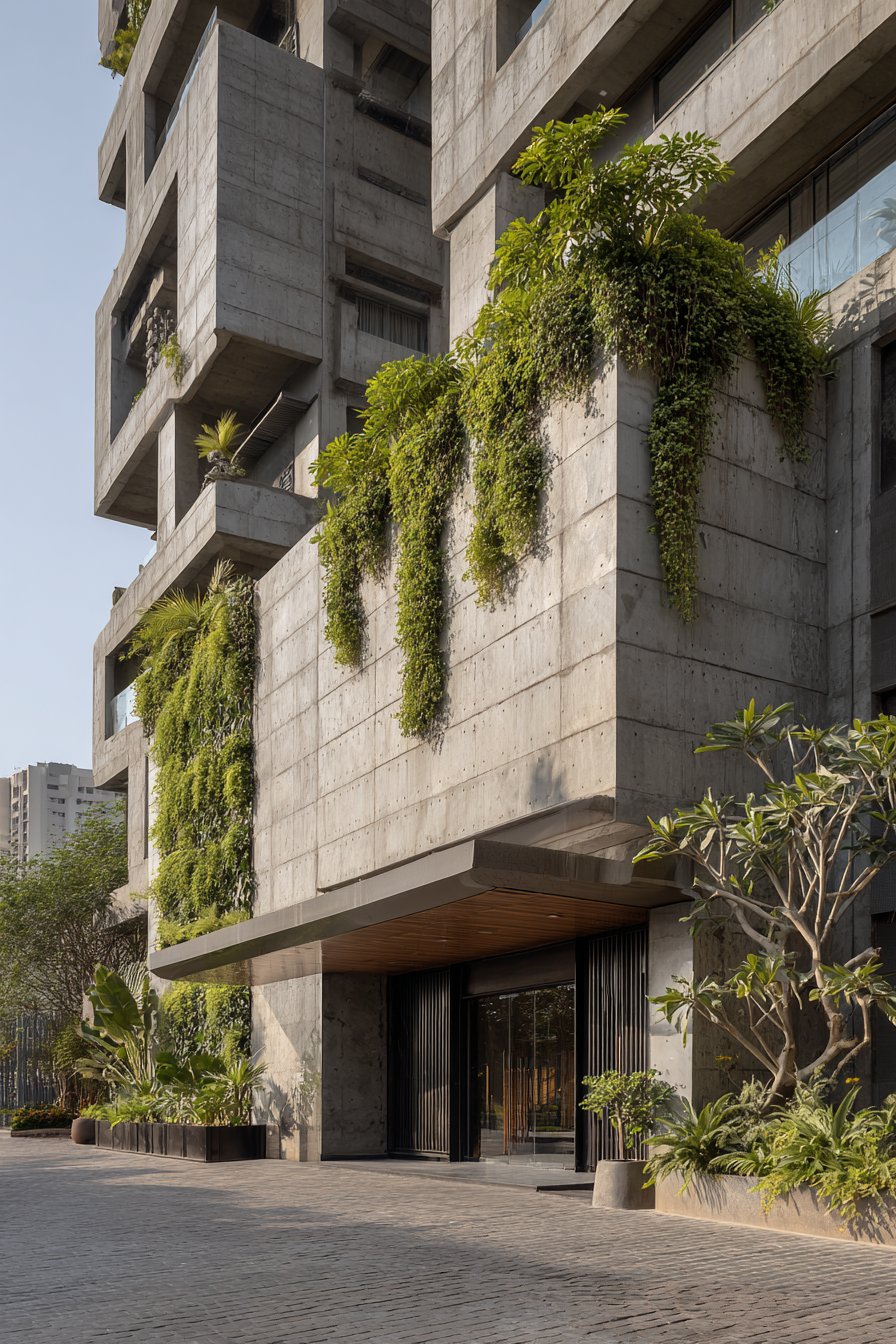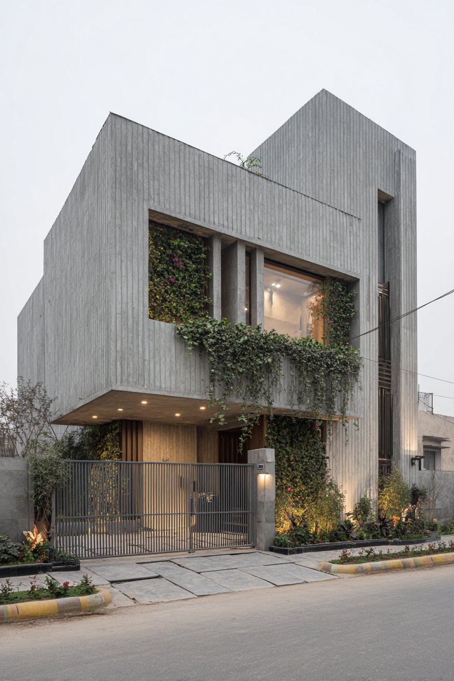 Embracing the raw, unfinished aesthetic that celebrates materials in their most honest form, this industrial-style compound wall showcases concrete in all its utilitarian glory. The visible formwork texture—horizontal lines created by the wooden boards used during concrete pouring—remains as an intentional design feature rather than being concealed. Sections of exposed aggregate, where the surface is treated to reveal the stones within the concrete mix, add textural variation and visual interest. This approach transforms what might be considered construction imperfections into deliberate design elements that communicate authenticity and architectural confidence.