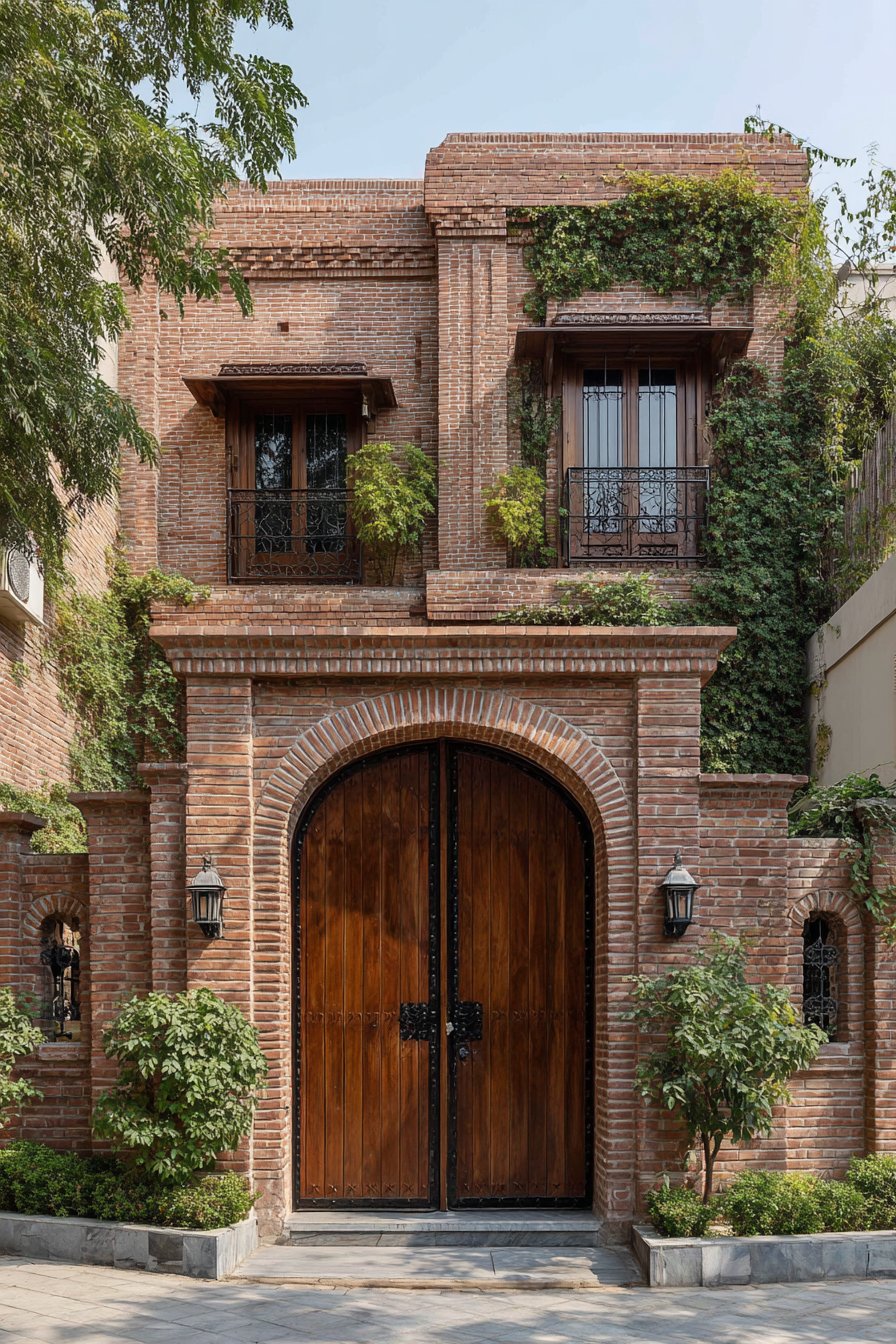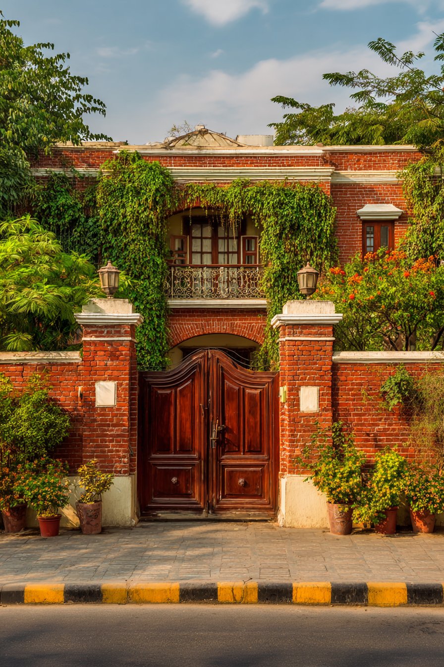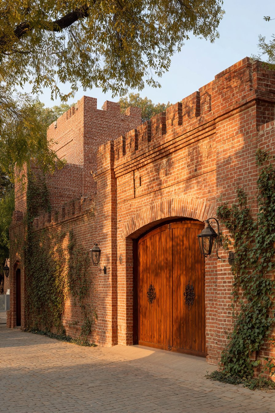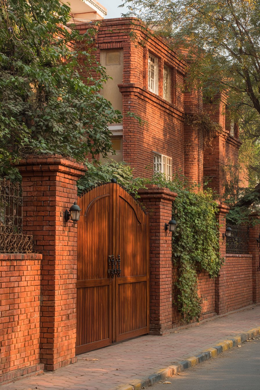 The arched wooden double gate serves as the compound wall’s focal point, its design rooted in classical architecture where arched openings symbolized welcome and abundance. The substantial timber construction, complemented by traditional iron hardware including strap hinges and decorative bolt heads, speaks to craftsmanship and permanence. The arch form itself is both structurally sound—distributing loads efficiently to either side—and aesthetically pleasing, its curved top providing relief from the otherwise linear quality of brick coursing.