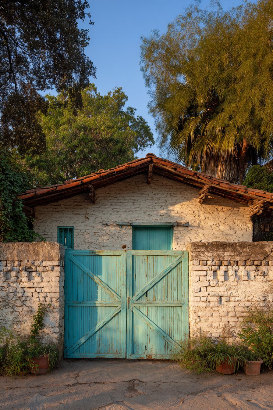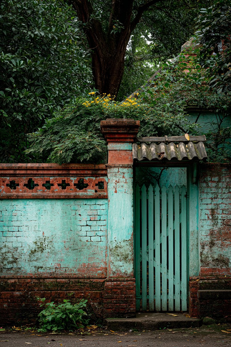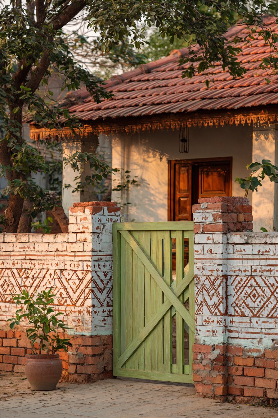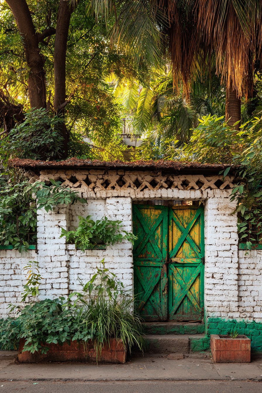 The arched wooden double gate serves as the compound wall’s focal point, its design rooted in classical architecture where arched openings symbolized welcome and abundance. The substantial timber construction, complemented by traditional iron hardware including strap hinges and decorative bolt heads, speaks to craftsmanship and permanence. The arch form itself is both structurally sound—distributing loads efficiently to either side—and aesthetically pleasing, its curved top providing relief from the otherwise linear quality of brick coursing.