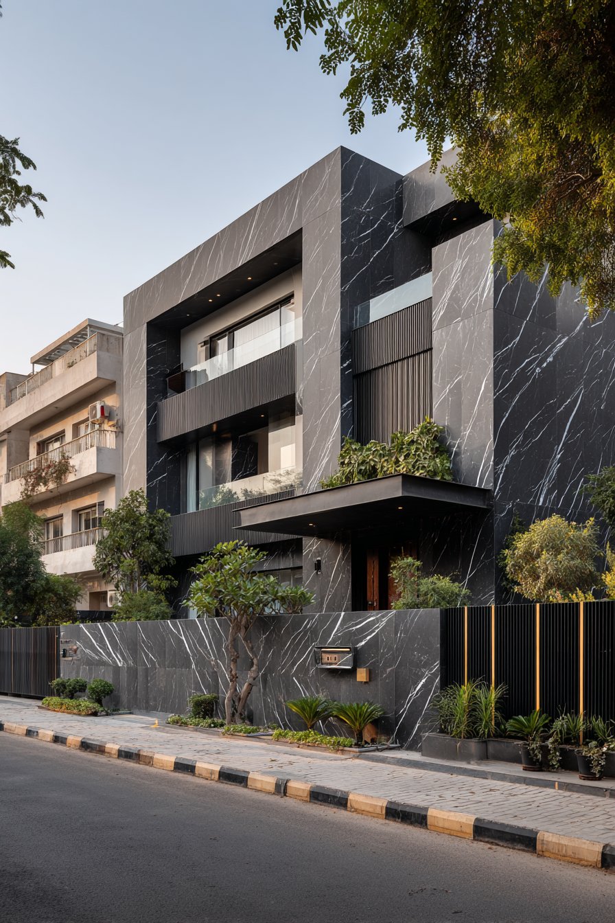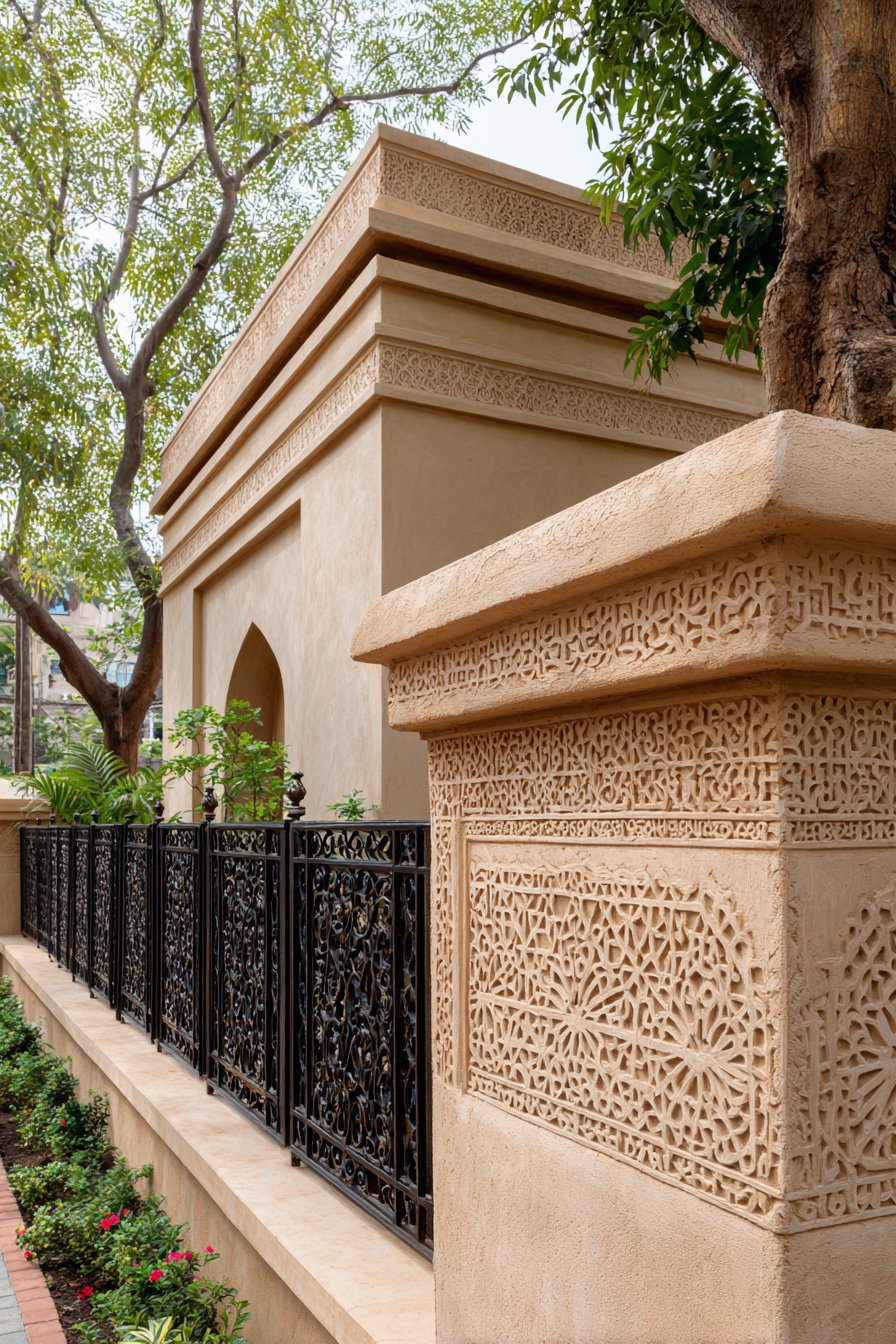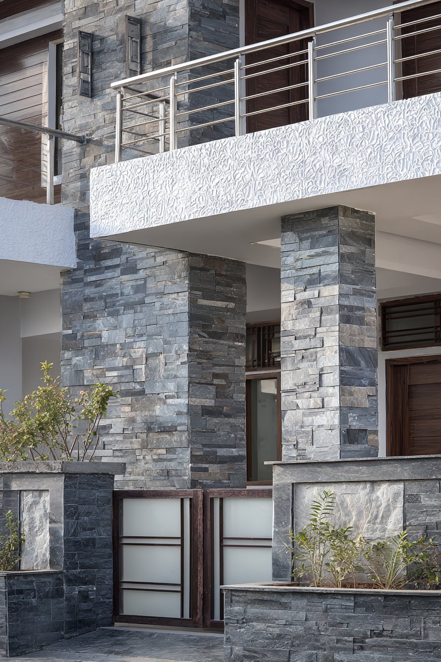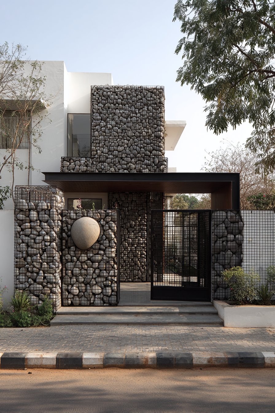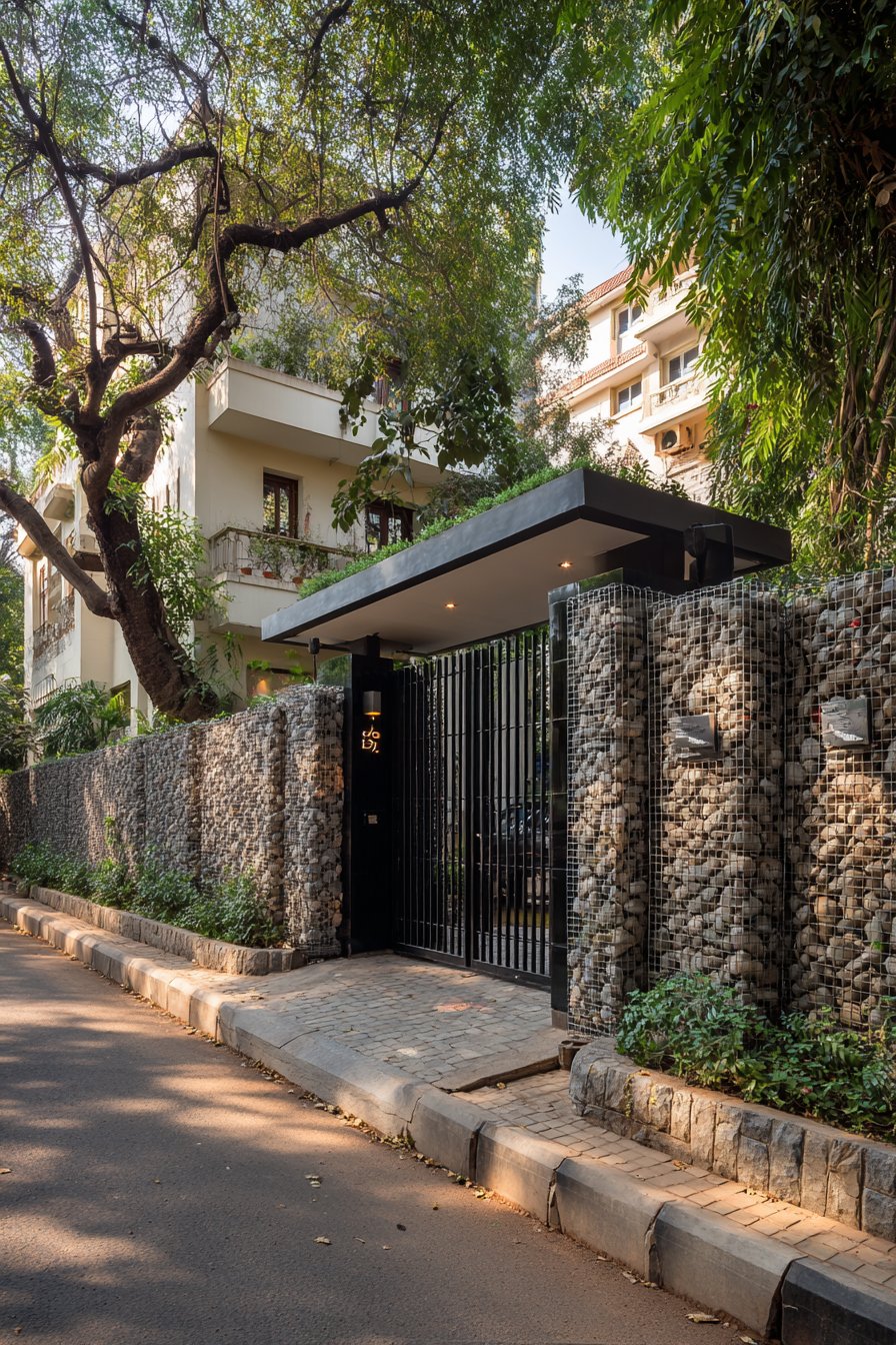 Stainless steel horizontal railings spanning between structural pillars introduce a third material that bridges the granite and plaster sections. These railings serve multiple purposes: they reduce the visual mass of an otherwise solid wall, allow air circulation, provide a modern industrial accent, and create interesting shadow patterns as sunlight filters through. The spacing between horizontal rails is calculated to maintain privacy while preserving a sense of openness—a balance that’s particularly important for urban properties where compound walls can otherwise feel claustrophobic.