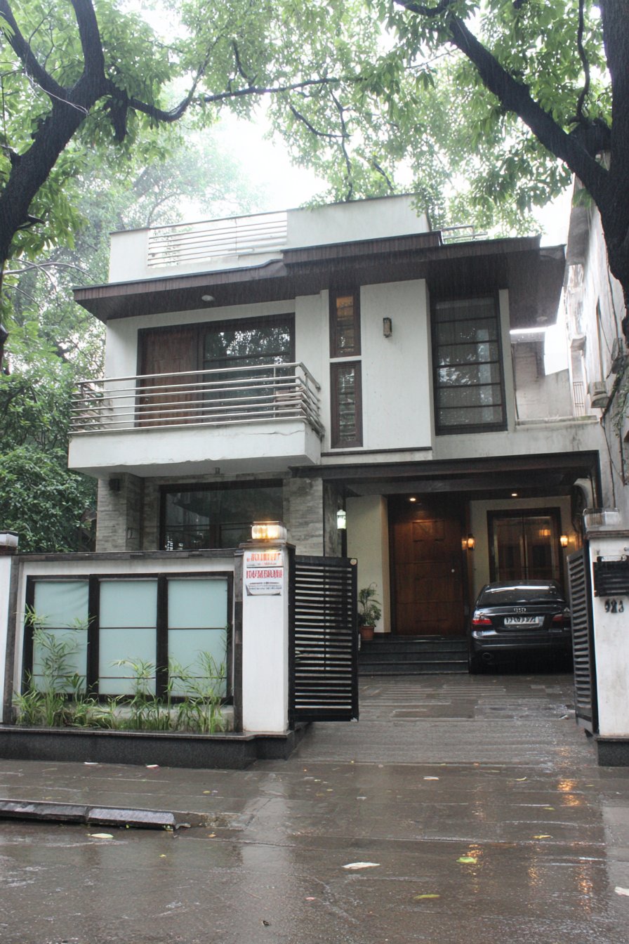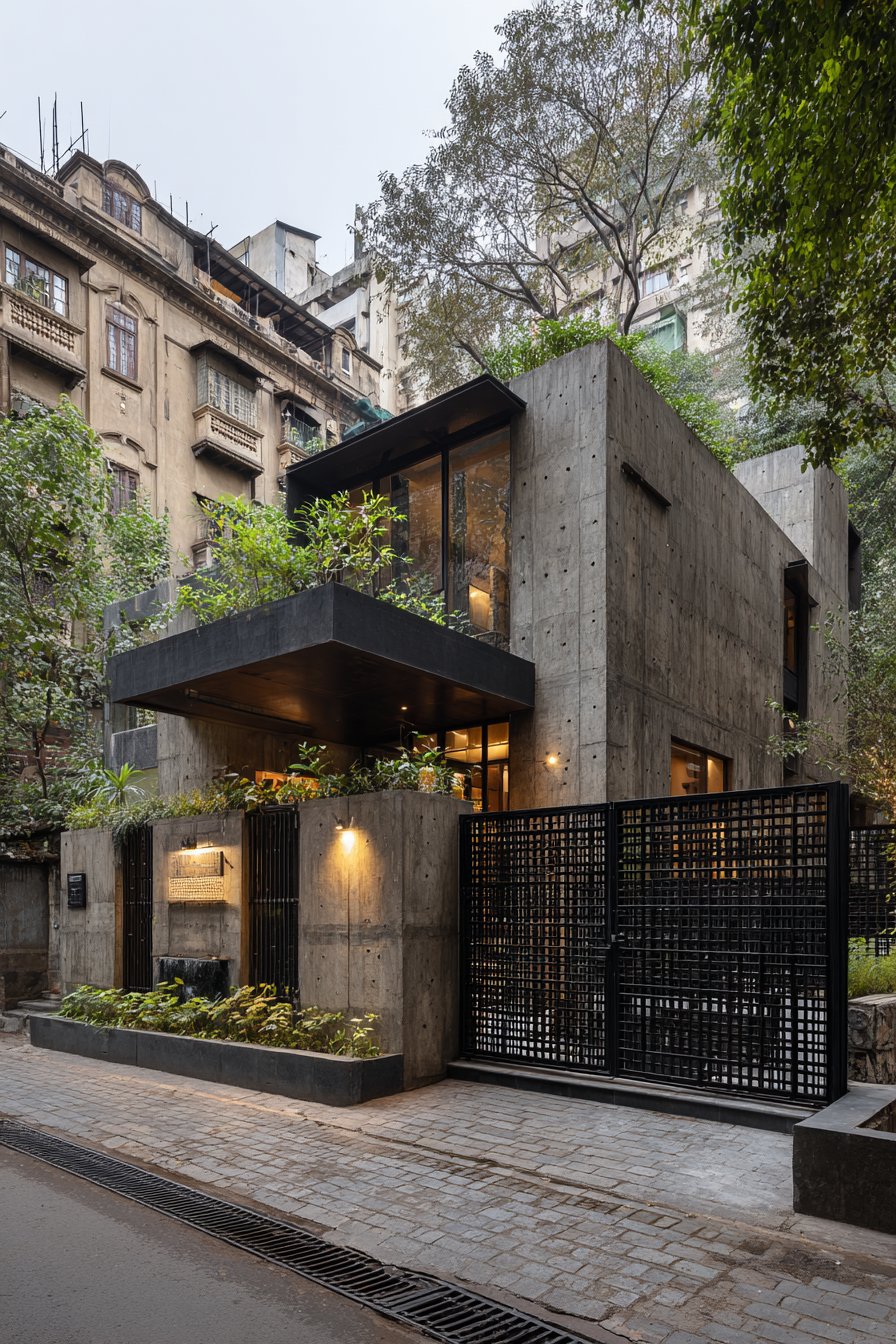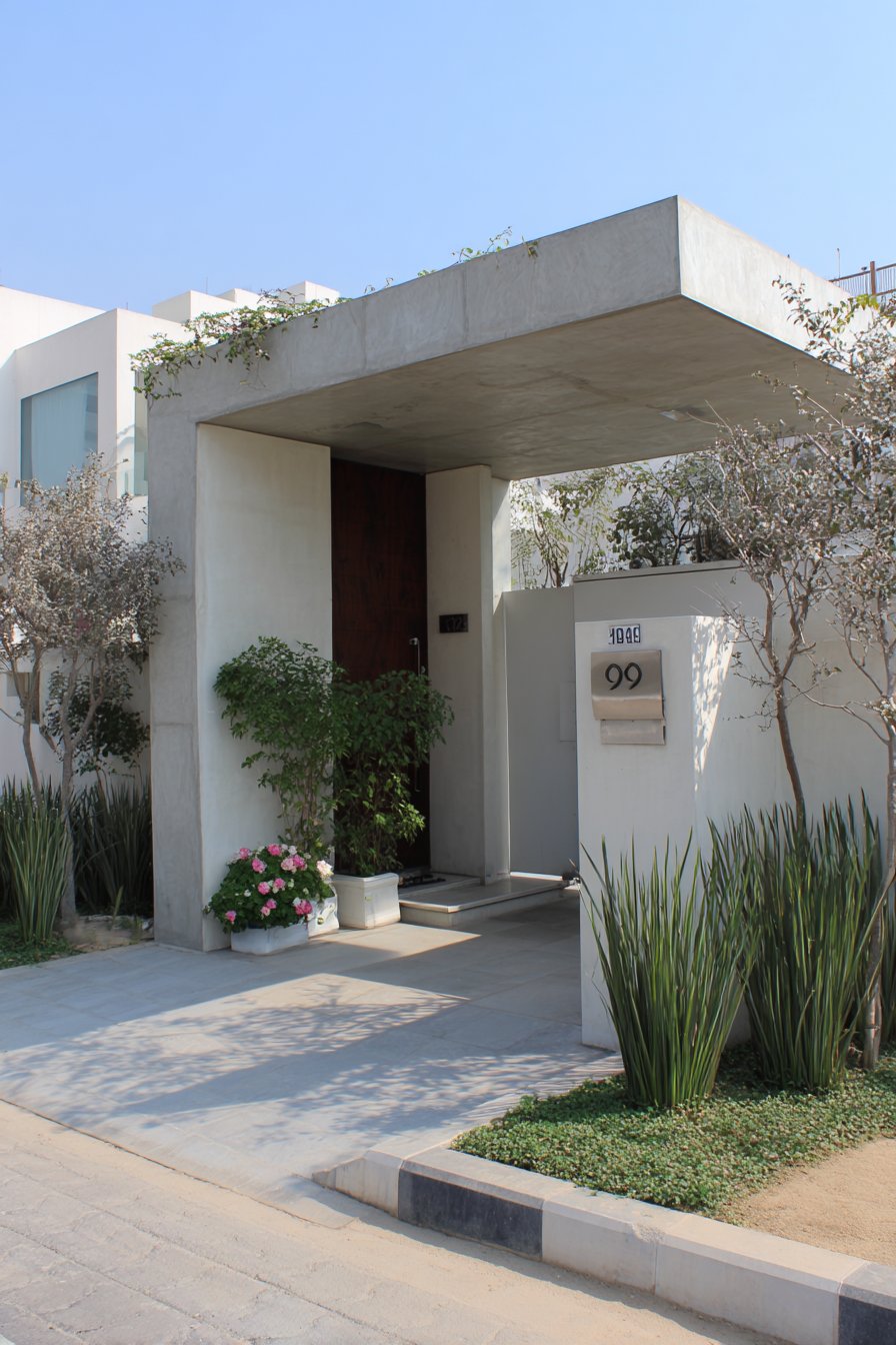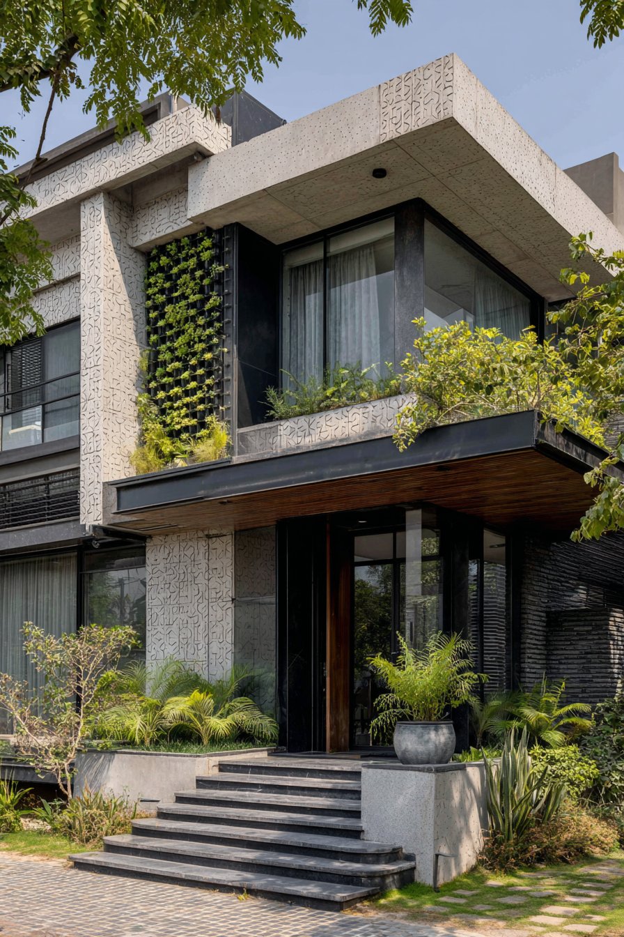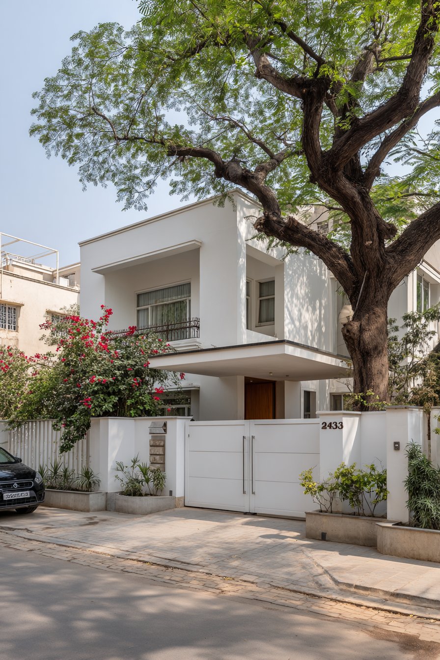 Stainless steel horizontal railings spanning between structural pillars introduce a third material that bridges the granite and plaster sections. These railings serve multiple purposes: they reduce the visual mass of an otherwise solid wall, allow air circulation, provide a modern industrial accent, and create interesting shadow patterns as sunlight filters through. The spacing between horizontal rails is calculated to maintain privacy while preserving a sense of openness—a balance that’s particularly important for urban properties where compound walls can otherwise feel claustrophobic.