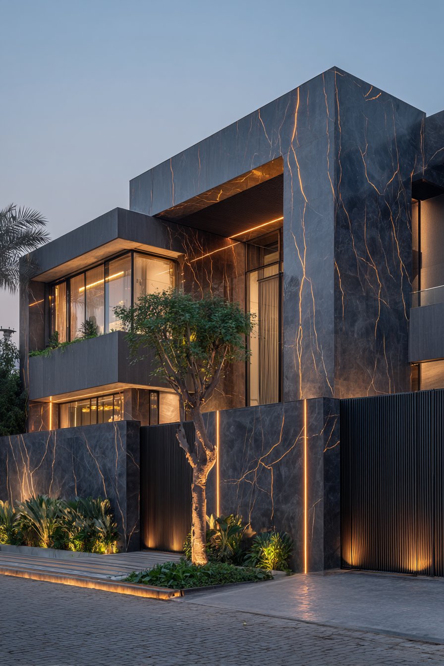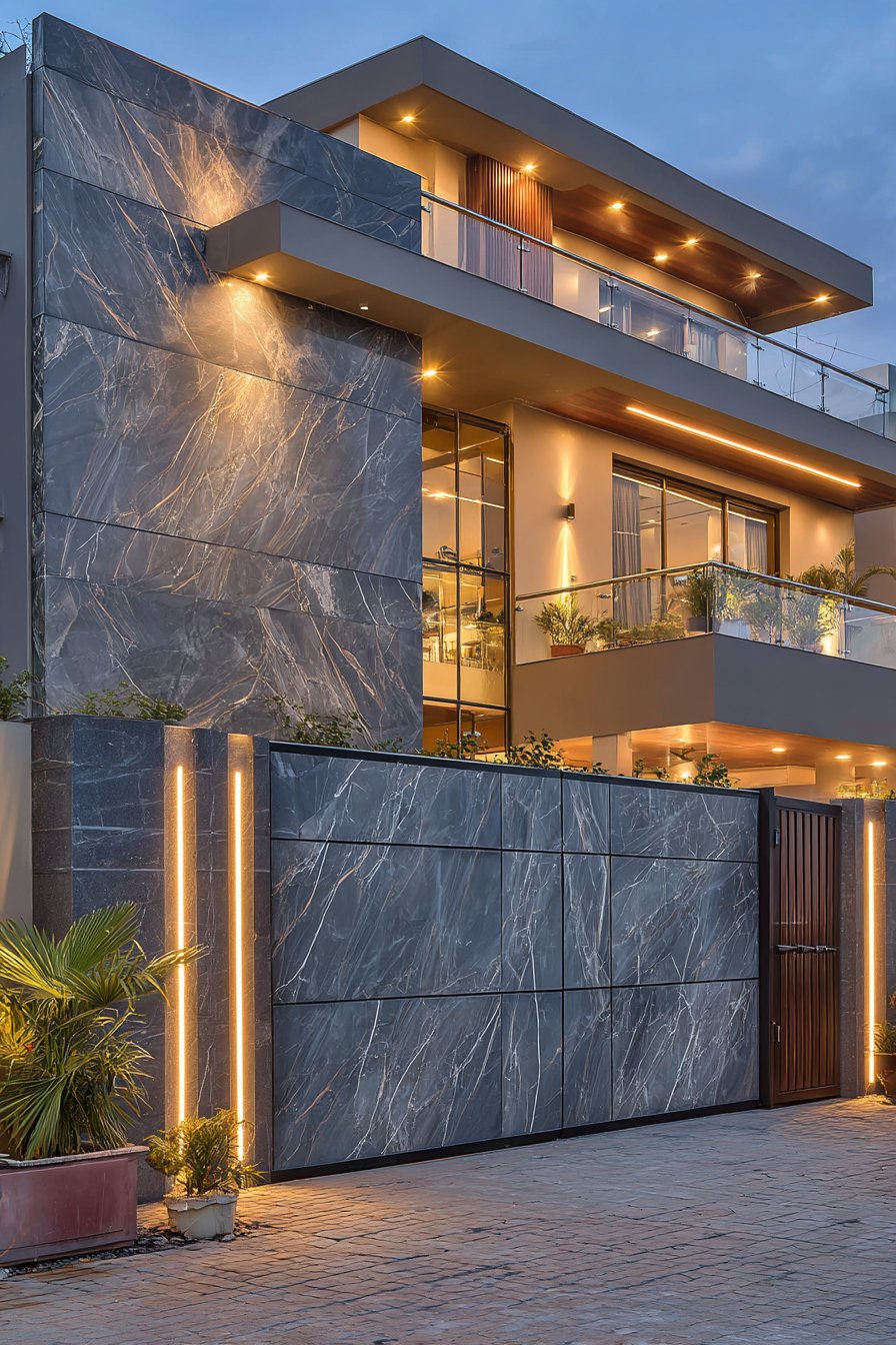 This sophisticated compound wall exemplifies the power of material contrast in contemporary architecture. The design divides vertically, with the lower half clad in dark grey granite slabs featuring a polished finish that reflects light and creates a sense of refinement. The upper portion transitions to white textured plaster, providing visual lightness that prevents the wall from appearing too heavy or imposing. This intentional division creates horizontal emphasis while the granite’s polished surface adds an element of luxury typically associated with high-end residential architecture.