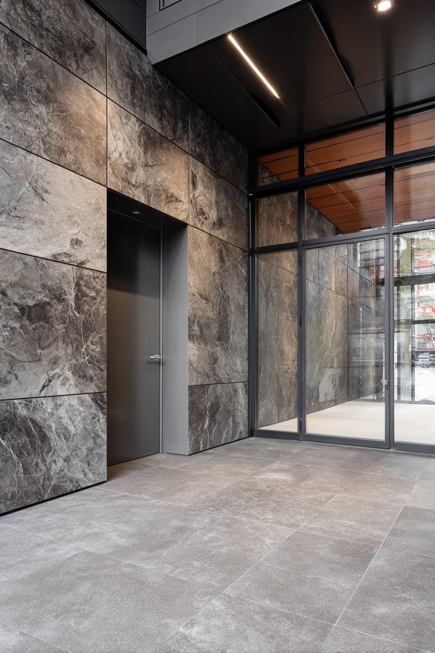 The contemporary gate in powder-coated aluminum with frosted glass inserts continues the modern luxury aesthetic while introducing transparency that balances the solid stone’s opacity. The aluminum framework, precisely fabricated with welded joints and seamless corners, demonstrates contemporary manufacturing capabilities. Frosted glass panels provide privacy while allowing light transmission, creating luminous quality especially when backlit. The combination of metal, glass, and stone creates multi-material composition that’s visually rich and thoroughly contemporary.
