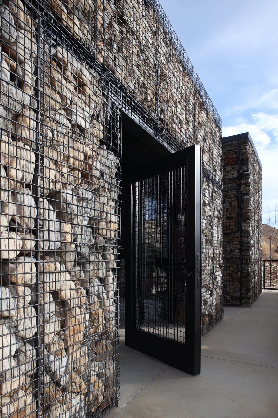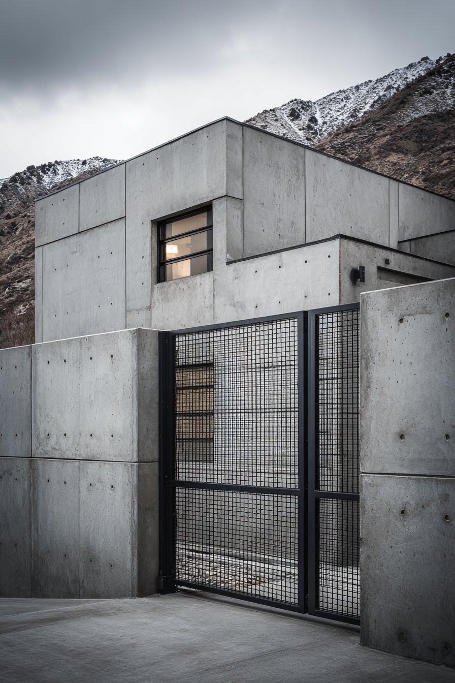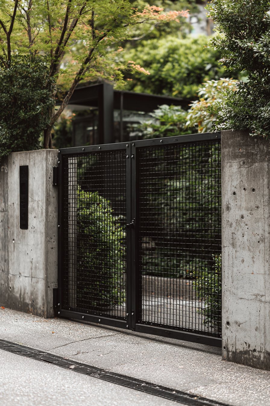 The black powder-coated steel frame gate with welded mesh infill perfectly complements this industrial aesthetic. The gate’s honest expression of its materials and construction methods—visible welds, exposed framework, utilitarian mesh—aligns with the wall’s raw concrete character. The powder coating provides durability and weather resistance while the black finish creates strong contrast against the lighter concrete, making the entrance clearly legible while maintaining the overall industrial design vocabulary.