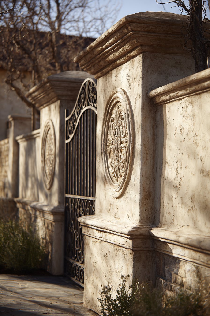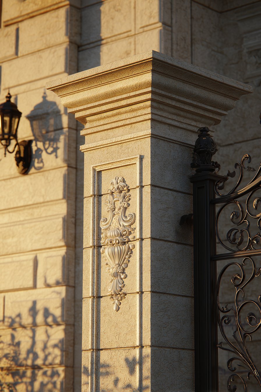 Decorative pilasters at intervals, finished in slightly darker tone, create vertical emphasis while adding dimensional interest to otherwise flat wall surface. These engaged columns, projecting 4-6 inches from the main wall plane, reference classical architecture while providing visual rhythm along the wall’s length. The darker tone—perhaps several shades deeper in the same blue-grey family—creates subtle contrast that makes the pilasters read as separate architectural elements. The pilasters also serve structural function, providing reinforcement at intervals while creating natural locations for drainage or service access if needed.