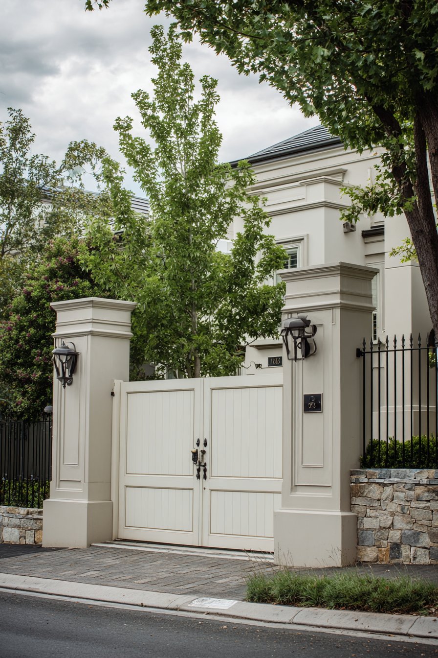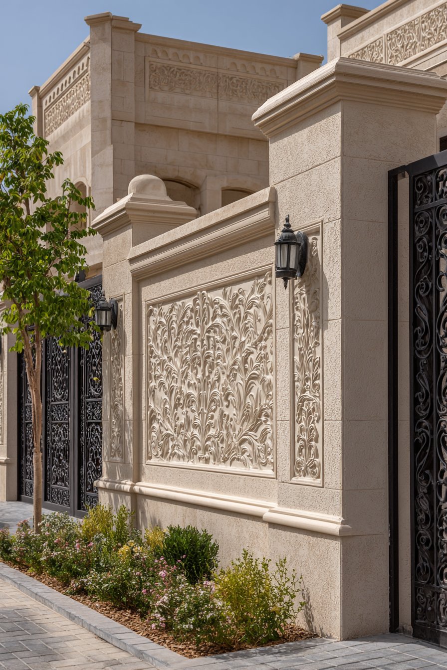 This approach to compound wall design requires exceptional execution because there are no decorative elements to distract from imperfections. Every surface must be perfectly smooth, every corner precisely aligned, every transition carefully detailed. The payoff is a wall that projects calm confidence and timeless elegance, serving as a neutral backdrop that allows the home’s architecture and landscaping to take center stage.