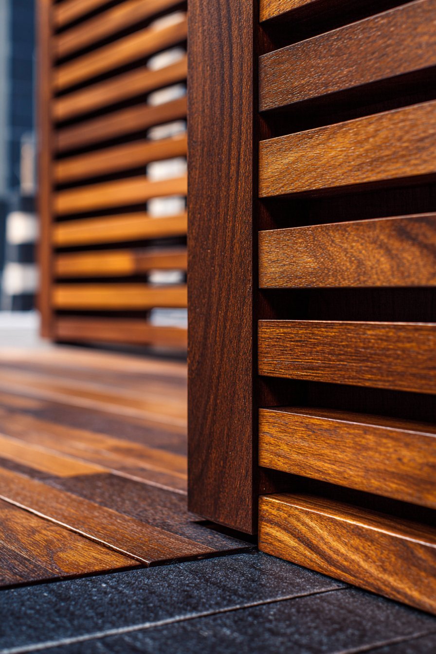 Natural teak was selected for its exceptional durability and beautiful aging characteristics. Unlike softer woods that deteriorate quickly in exterior conditions, teak contains natural oils that resist moisture, insects, and decay. As it weathers, teak develops a silvery-grey patina that many find even more attractive than the original honey-brown color. The vertical orientation of the slats emphasizes height and creates clean contemporary lines, while their uniform spacing creates rhythmic repetition that’s visually calming yet architecturally sophisticated.