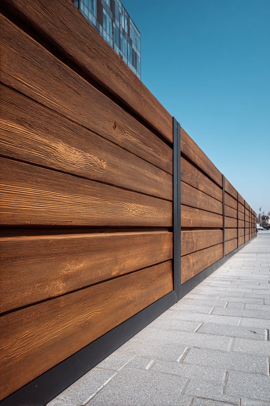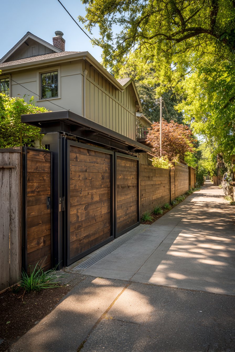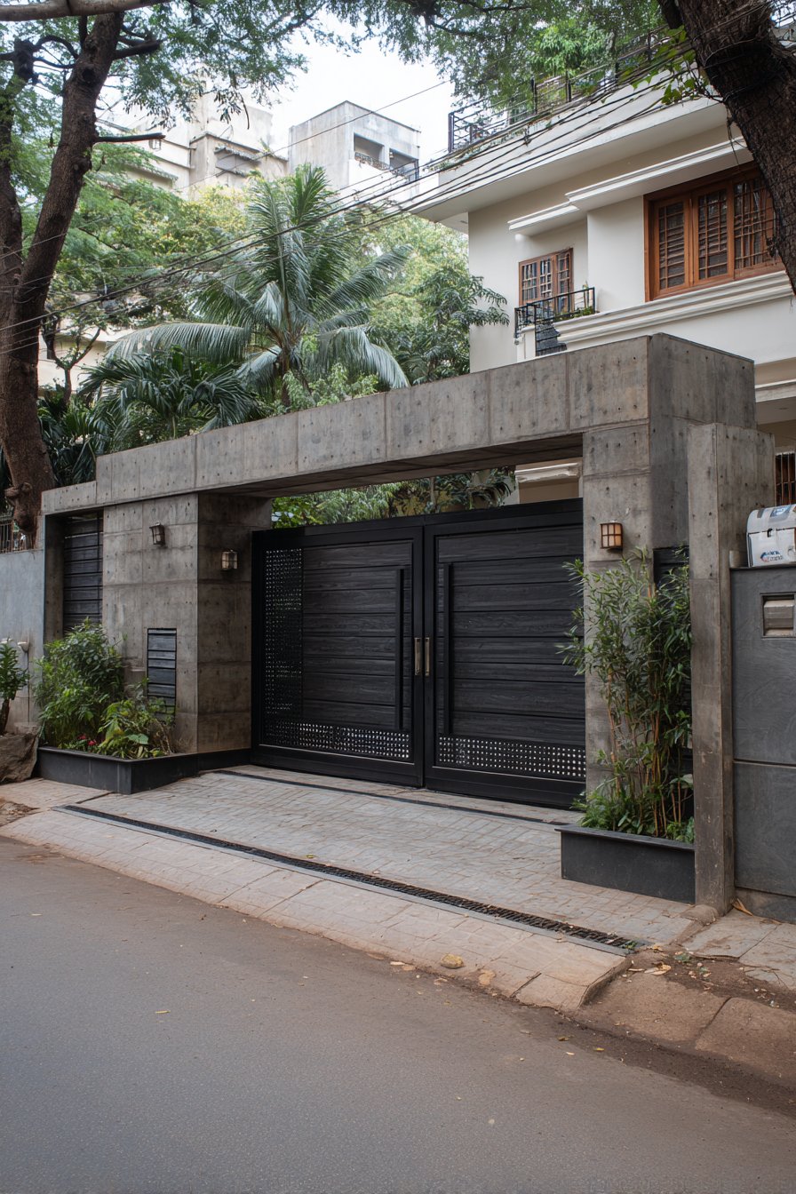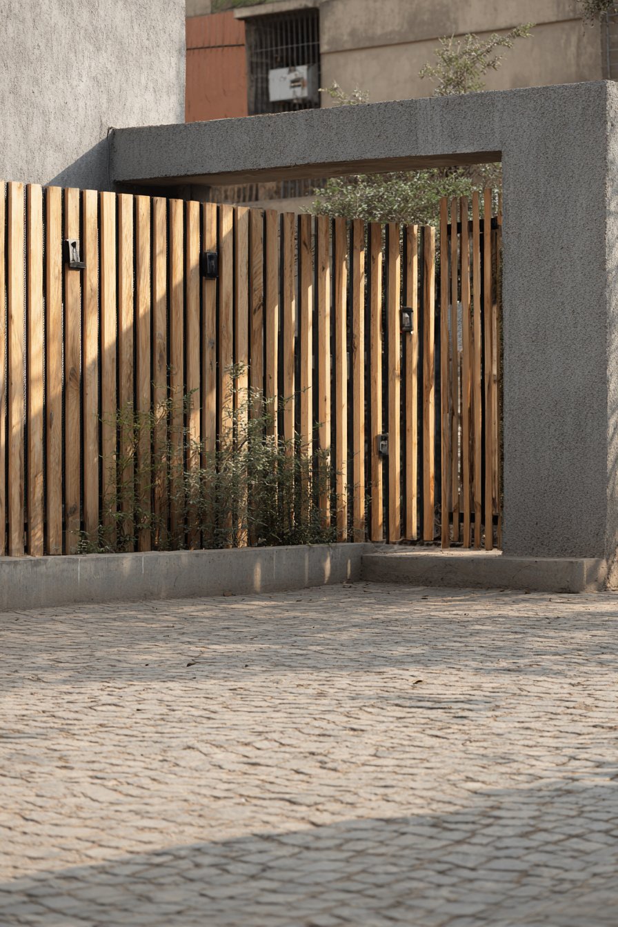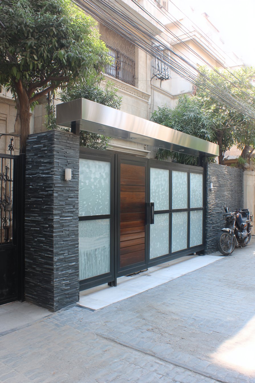 The modern sliding gate continues the wooden slat design vocabulary, maintaining visual continuity across the compound wall’s length. The gate’s sliding mechanism, mounted on industrial-grade rollers, provides smooth operation while the continuation of the slat pattern makes the gate nearly invisible when closed—only the subtle track at ground level reveals its presence. This seamless integration demonstrates the importance of carrying design elements consistently throughout all components of the compound wall system.