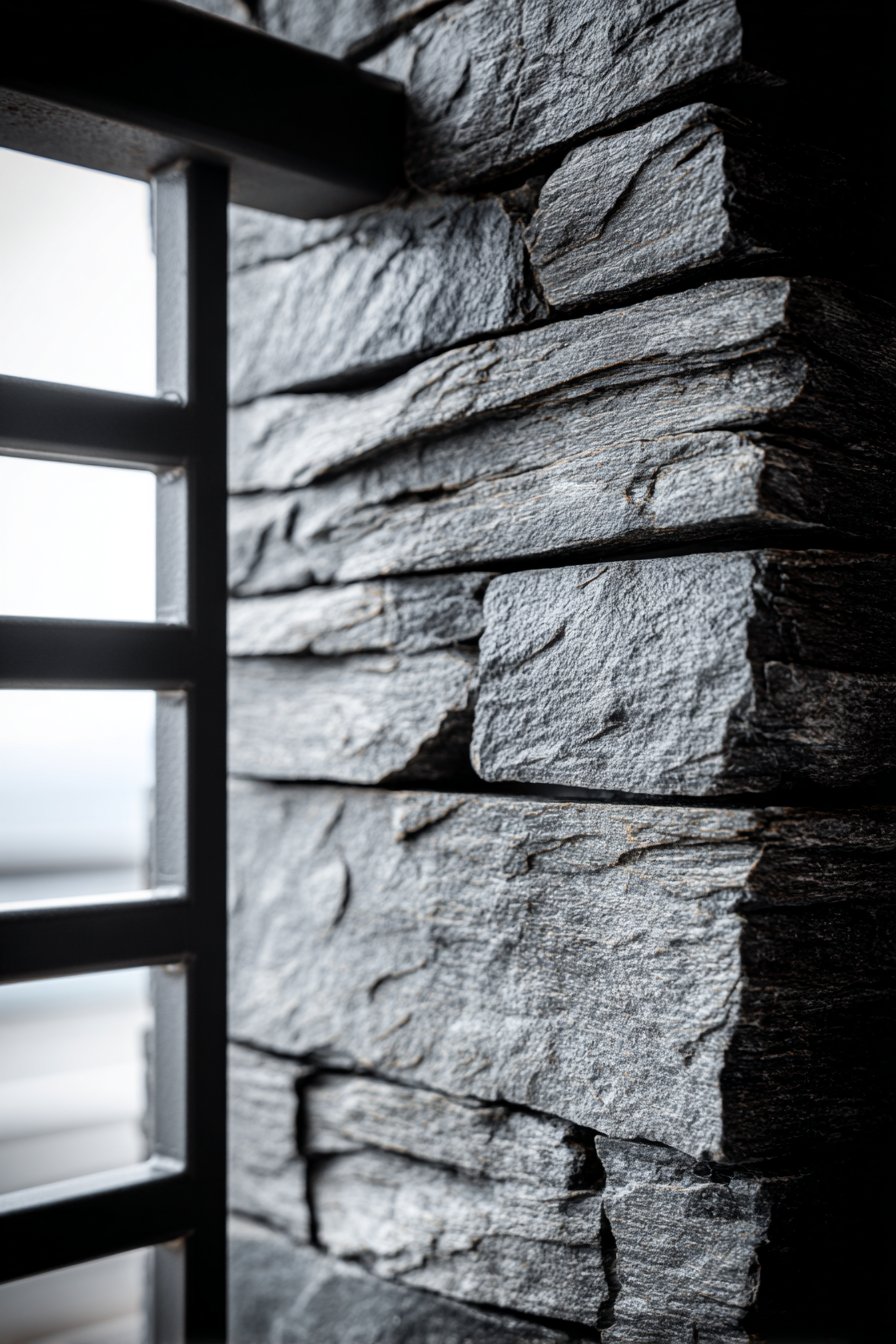 The slate’s natural cleft surface texture distinguishes this wall from smooth-faced alternatives. When slate is split rather than sawn, the resulting surface reveals the stone’s natural stratification and crystalline structure. This cleft surface creates countless small facets that reflect light differently, producing shimmering quality as viewing angle changes. The texture also creates tiny shadow pockets that add depth and prevent the dark stone from appearing flat or lifeless. The horizontal installation emphasizes the slate’s natural grain direction while creating strong linear emphasis.