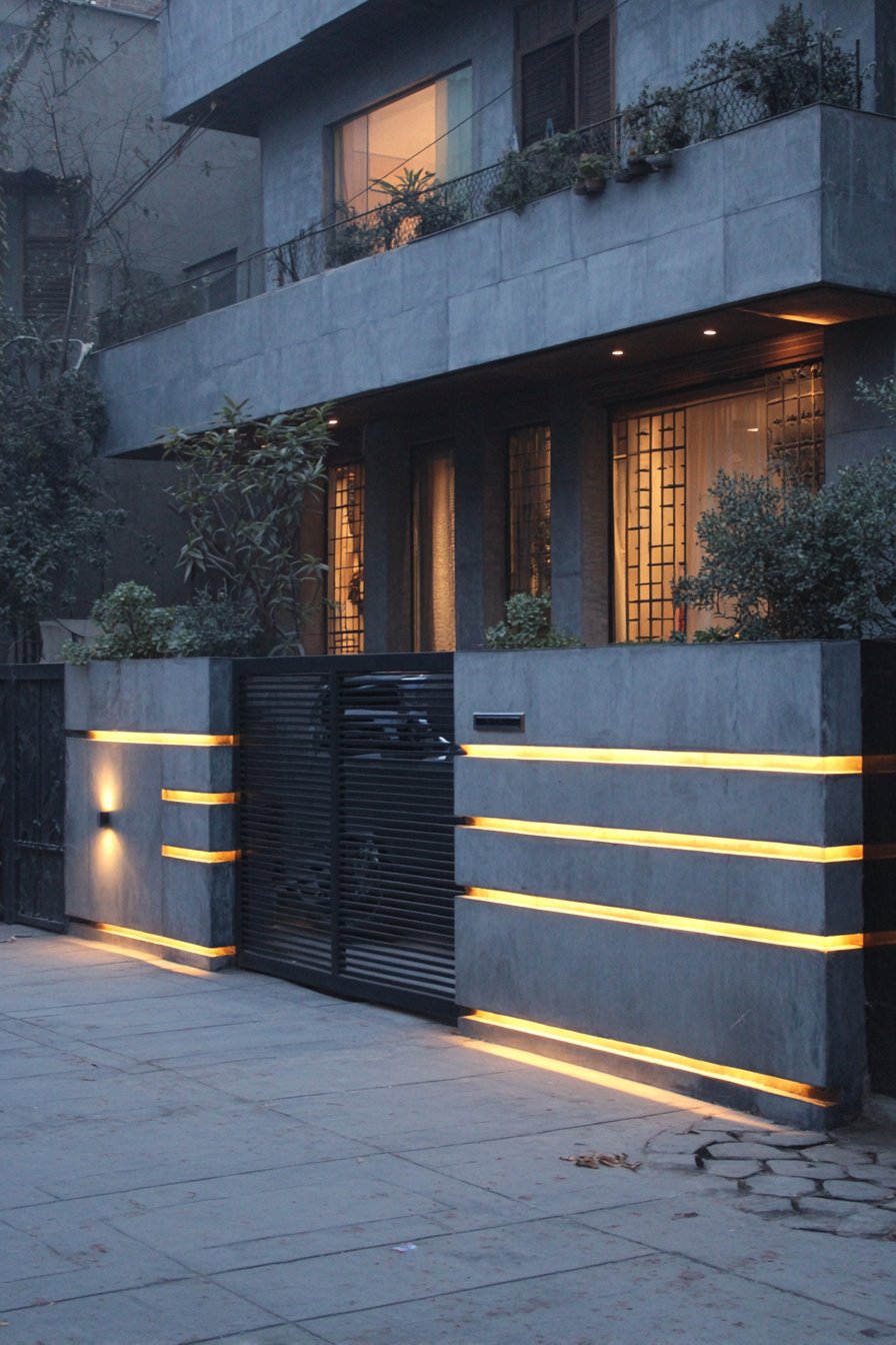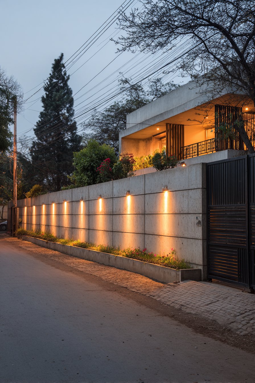 This cutting-edge compound wall features smooth concrete finish with integrated horizontal lighting channels that create dramatic nighttime illumination while remaining subtle architectural details during daylight hours. The concrete surface, sealed with matte finish in light grey tone, provides clean contemporary backdrop for the lighting integration. The horizontal channels, typically routed or formed into the concrete during installation, house LED strip lighting that remains hidden until illuminated. During day, these channels read as subtle shadow lines that create horizontal emphasis; at night, they transform into glowing accents that dramatically alter the wall’s appearance.