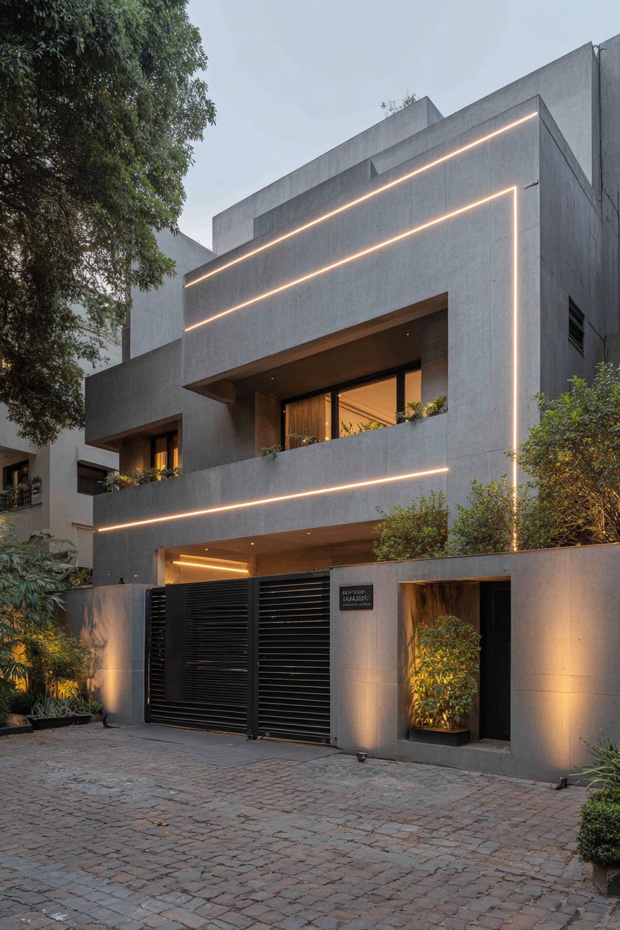 The minimalist steel gate with horizontal bars and automated mechanism continues the horizontal emphasis while providing functional entry. The gate’s simple bar design echoes the lighting channels’ linear quality, creating visual continuity between wall and gate. The automated mechanism—typically a sliding or swing gate operator—eliminates manual operation while the quiet motors and smooth movement enhance the luxury experience. The integration of gate automation with lighting controls allows coordinated operation where lights can activate when gate opens, enhancing both security and dramatic effect.